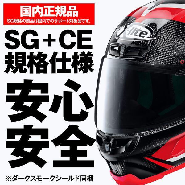 【仕様1】カーボンとコンポジットファイバーをシェルに採用。帽体はMFJ公認SG規格、シールドはECE規格をクリアーしました。軽さと強度を両立させたフラッグシップモデル