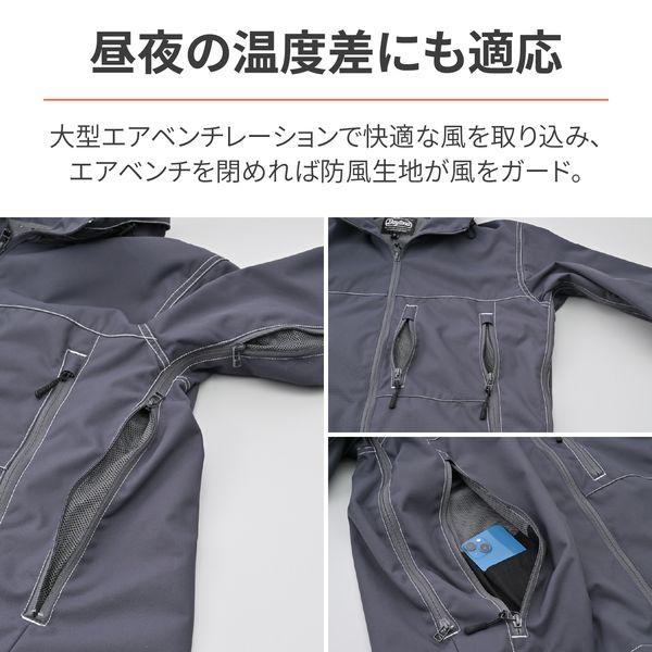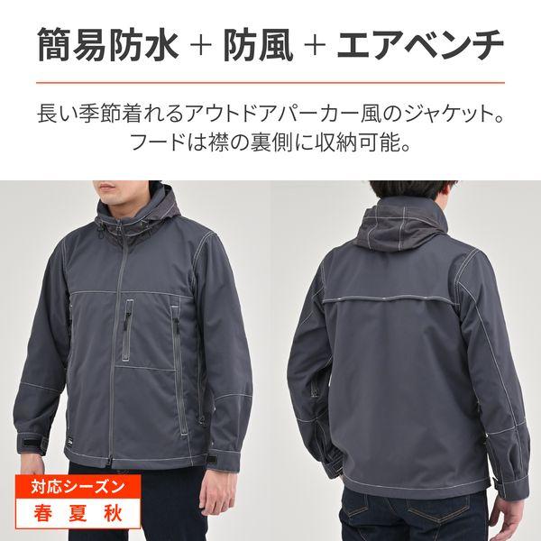 簡易防水+防風+大型エアベンチポケットにより長い季節着用可能なアウトドアパーカー風デザインのエアインテークパーカージャケット。