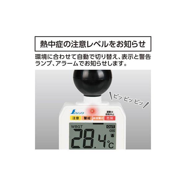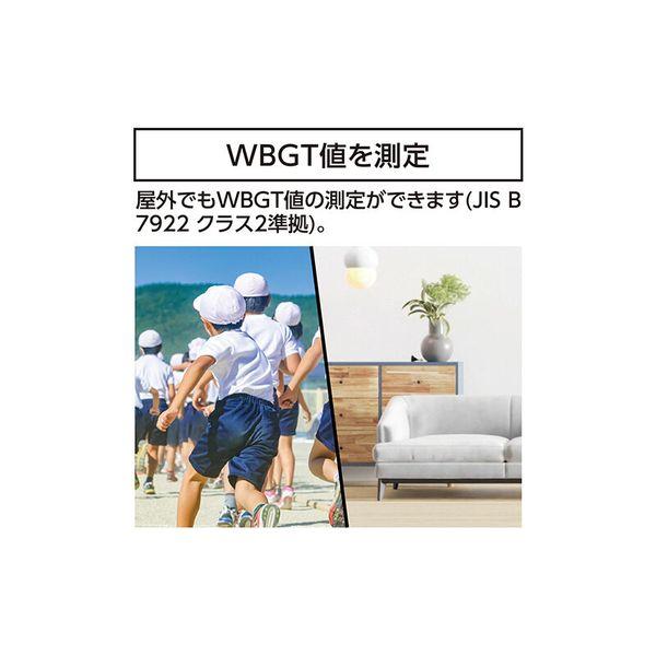 【商品説明】●特長●屋外でもWBGT値の測定ができます(JIS B 7922:2017 クラス2準拠)。●熱中症の注意レベルを環境に合わせて自動で切り替え、表示と警告ランプ、アラームでお知らせします。●読み取りやすい文字高18mmの大型液晶を採用しました。●屋内と屋外の測定切り替えができる屋内モード/屋外モード切替機能付です。●持ち運びや取り付けに便利なホルダー・バンド用アタッチメントとバンド付です。●使用する場所によって設置方法を選べる、フック穴と三脚取付ネジ穴付です。●仕様、規格●精度:〈WBGT〉±2℃(JIS B 7922:2017 クラス2準拠)〈温度〉20~50℃:±0.6℃ それ以外:±1℃ 〈湿度〉30~90%:±5%(20~30℃の環境で) それ以外:±10%●測定範囲 WBGT:0~50℃ 温度:0~50℃ 湿度:10~95%●最小表示 WBGT:0.1℃ 温度:0.1℃ 湿度:0.1%●使用環境 温度:0~50℃ 湿度:30~90℃ 風速:0.3m/s以上(結露しないこと)●保管環境 温度:-10~60℃ 温度:30~90%(結露しないこと)●測定間隔 20秒●熱中症注意表示 4段階●アラーム音量(10cm離れて) 小:60dB 大:70dB●警告ランプ 2段階●電源 単4アルカリ乾電池 2本(付属の電池はモニター用の為、寿命が短い場合があります。)●材質 本体:ABS樹脂 液晶カバー:ポリカーボネート樹脂 液晶:ガラス●本体サイズ 115×60×35mm●製品質量 115g(電池含)●三脚取付ネジ 1/4インチ●付属品 バンド、ホルダー・バンド用アタッチメント、M3ネジ