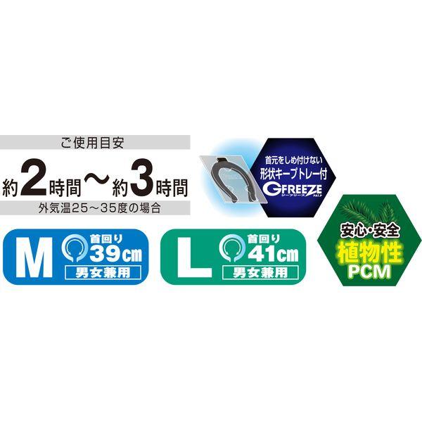 【商品説明】新素材P.C.M!保冷剤とは違う! 22℃を維持!! 冷却すると液体から固体に変わる特殊素材で、22℃以下の気温や水でも冷却固体化することが可能です。外気温25~35℃の場合、約2時間~3時間 冷やすことができます。繰り返し使えて経済的です。装着後の落下を防止するセーフティーコード付き。装着穴を左右に設けた新しいアイスジーの登場。●サイズ:太さ約3cm、Mサイズ、首回り39cm ●重量:252g ●カラー:ブラック