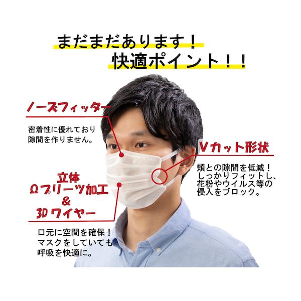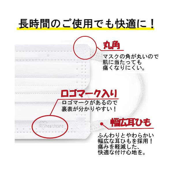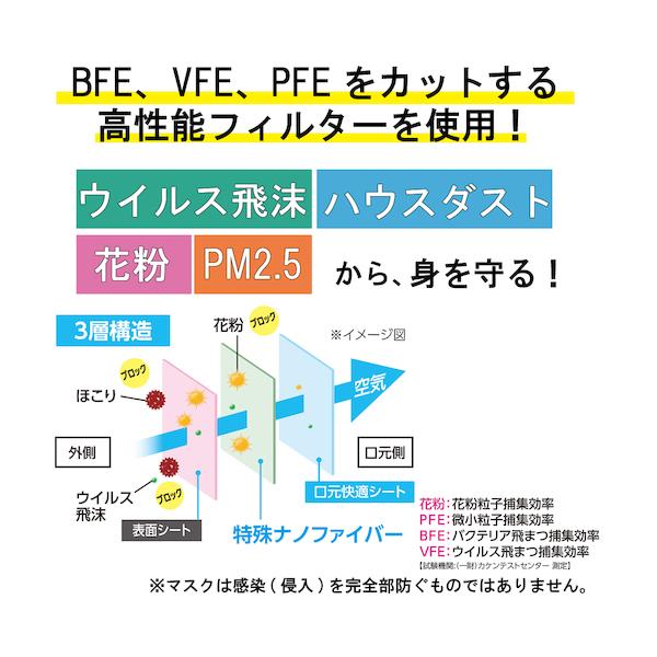 【商品説明】【特長】●やわらかく幅広の耳ひもで耳が痛くなりにくいです。●口元空間をキープする3Dワイヤーで会話が楽にできます。●太さの違う繊維を組み合わせて、通気性を保ちながら飛沫の侵入を防ぎます。●中間層に国産メルトブローを採用したスゴ息フィルターで通気性がUPしています。【用途】●風邪・花粉・ウイルス飛沫対策に。【仕様】●サイズ:小さめ●縦(mm):90●横(mm):145●構造:3層●BFE(細菌ろ過効率):99%●PFE(微粒子ろ過効率):99%●VFE(ウィルス飛沫ろ過効率):99%【仕様2】●個包装(1枚単位)●耳ひも:幅広●センターワイヤー:有●耳掛けタイプ【材質/仕上】●本体、フィルター:ポリプロピレン(PP)、ポリフッ化ビニリデン●耳ひも:ポリエステル、レーヨン、ポリウレタン●ノーズフィッター・3Dワイヤー:ポリエチレン【注意】●マスクは感染を完全に防ぐものではありません。