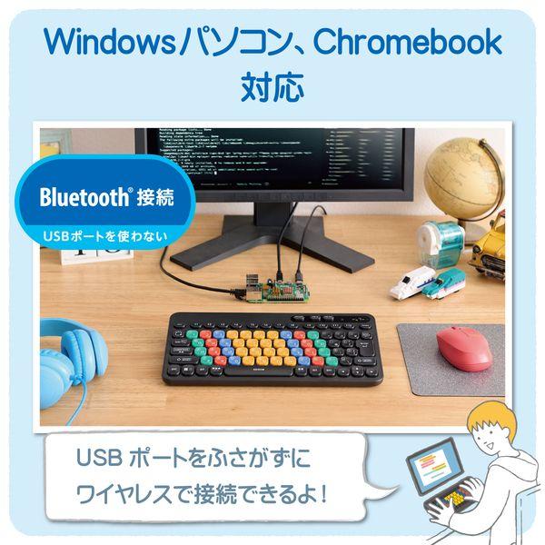 【商品説明】●正しいキー入力が楽しく覚えられる、パソコン学習用キーボード“KEY PALETTO(キーパレット)”です。●実際に入力される文字と同じ印字デザインで、アルファベットに不慣れな子どもたちの混乱を防ぎます。●本製品は、プログラミング言語の開発や指導方法などを、幅広く研究・提案されている、大阪電気通信大学の兼宗進副学長(2023年5月現在)に監修いただいた製品です。●原色に近いわかりやすい配色で、キーを打つ指が楽しく覚えられます。●色の判別が苦手な色覚特性のある方でも、色の違いを見分けやすいカラーバランスに調整しています。●本体色は、汚れや傷が目立ちにくいチャコールブラックを採用しています。●子どもの手の大きさに合わせた、タブレットなどでも使用しやすい17mmピッチのコンパクト設計です。●軽い力でもサクサクと打てる新設計のメンブレン方式を採用しています。●使用頻度や機能などによってキー形状に変化をつけることで、これからタッチタイピングを学ぶ子どもたちが押し間違えしにくくなる工夫をこらしました。●最大500万回の打鍵に耐える丈夫なキーを採用しています。●キーのすき間にペンの先端や定規を差し込みにくく、いたずらにも強い構造です。●ころんとした丸みを帯びたキー形状と、なじみのよい手ざわりで子どもたちが親しみを感じられるよう仕上げました。●付属のローマ字入力サポートカードや、メモなどを立てかけられるカードスタンド付きです。●カードスタンドにピッタリサイズのオリジナルカードを作成できるテンプレートや、Scratchなどの学習に便利な専用カードのデータを無料で公開しています。●プログラミングやパソコン学習に特化した機能を盛り込んだ、独自の配列を採用しています。●押し間違いによる混乱を避けるため、使用頻度の低い機能を排除することにより、より楽しくキーボード操作を学習できるよう配慮しました。●気づかないうちに押して有効にしてしまいやすいCaps Lock機能を、スイッチのON/OFFによって無効にする“Caps Lock機能無効化スイッチ”を搭載しています。●“Caps Lock機能無効化スイッチ”は、小さな指でも操作しやすく、ロック状態がひとめでわかるスイッチを採用しています。●キーボードに貼って、キーの名前や読み方を覚えられる“よみがなシール”付きです。●キーに貼っても手触りがほとんど変わらず、覚えたらはがせる高品質なシールを採用しました。●本体裏面にお名前スペースを設け、紛失や取り間違えを防止します。●本体に約10度の傾斜をつけられるキーボードスタンドにより、キーを打ちやすくし、手や腕への負担がかかりにくくなります。●Bluetooth(R) Low Energyに対応したパソコンなどの機器で、USBポートをふさがずにワイヤレス接続ができます。●レシーバーを挿す必要がないため、USBポートが少ない薄型パソコンやタブレットにもおすすめです。●本体の表面には、使わないときに電源をオフにできるスイッチがあり、不使用時の電池の消耗を防止できます。●抗菌加工によって、菌の繁殖を抑え、清潔に保ちます。(抗菌範囲:キーボード筐体、印刷部分)●※こちらの製品は表面上における細菌の増殖を抑制、あるいは阻害する性能を有したもので、財団法人日本規格協会(JSA)が定める抗菌性試験に準拠したものです。●単3形乾電池1本で約2年使える長寿命設計です。●自社環境認定基準を1つ以上満たし、『THINK ECOLOGY』マークを表示した製品です。●環境保全に取り組み、製品の包装容器が紙・ダンボール・ポリ袋のみで構成されている製品です。●廃棄物削減に取り組み、製品に同梱する取扱説明書等をペーパーレス化した製品です。