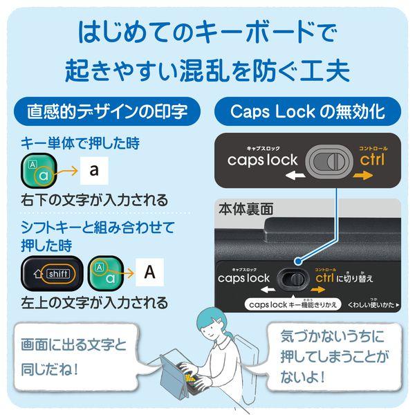 【商品説明】●正しいキー入力が楽しく覚えられる、パソコン学習用キーボード“KEY PALETTO(キーパレット)”です。●実際に入力される文字と同じ印字デザインで、アルファベットに不慣れな子どもたちの混乱を防ぎます。●本製品は、プログラミング言語の開発や指導方法などを、幅広く研究・提案されている、大阪電気通信大学の兼宗進副学長(2023年5月現在)に監修いただいた製品です。●原色に近いわかりやすい配色で、キーを打つ指が楽しく覚えられます。●色の判別が苦手な色覚特性のある方でも、色の違いを見分けやすいカラーバランスに調整しています。●本体色は、汚れや傷が目立ちにくいチャコールブラックを採用しています。●子どもの手の大きさに合わせた、タブレットなどでも使用しやすい17mmピッチのコンパクト設計です。●軽い力でもサクサクと打てる新設計のメンブレン方式を採用しています。●使用頻度や機能などによってキー形状に変化をつけることで、これからタッチタイピングを学ぶ子どもたちが押し間違えしにくくなる工夫をこらしました。●最大500万回の打鍵に耐える丈夫なキーを採用しています。●キーのすき間にペンの先端や定規を差し込みにくく、いたずらにも強い構造です。●ころんとした丸みを帯びたキー形状と、なじみのよい手ざわりで子どもたちが親しみを感じられるよう仕上げました。●付属のローマ字入力サポートカードや、メモなどを立てかけられるカードスタンド付きです。●カードスタンドにピッタリサイズのオリジナルカードを作成できるテンプレートや、Scratchなどの学習に便利な専用カードのデータを無料で公開しています。●プログラミングやパソコン学習に特化した機能を盛り込んだ、独自の配列を採用しています。●押し間違いによる混乱を避けるため、使用頻度の低い機能を排除することにより、より楽しくキーボード操作を学習できるよう配慮しました。●気づかないうちに押して有効にしてしまいやすいCaps Lock機能を、スイッチのON/OFFによって無効にする“Caps Lock機能無効化スイッチ”を搭載しています。●“Caps Lock機能無効化スイッチ”は、小さな指でも操作しやすく、ロック状態がひとめでわかるスイッチを採用しています。●キーボードに貼って、キーの名前や読み方を覚えられる“よみがなシール”付きです。●キーに貼っても手触りがほとんど変わらず、覚えたらはがせる高品質なシールを採用しました。●本体裏面にお名前スペースを設け、紛失や取り間違えを防止します。●本体に約10度の傾斜をつけられるキーボードスタンドにより、キーを打ちやすくし、手や腕への負担がかかりにくくなります。●むずかしい設定は不要で、USBケーブルをパソコンにつなぐだけですぐに使用できる有線接続タイプです。●パソコンからの給電で動作するため電池が不要で、電池切れの心配をせずに使用できます。●VCCI ClassBを取得した、電波障害が少ない設計です。●抗菌加工によって、菌の繁殖を抑え、清潔に保ちます。(抗菌範囲:キーボード筐体、印刷部分)●※こちらの製品は表面上における細菌の増殖を抑制、あるいは阻害する性能を有したもので、財団法人日本規格協会(JSA)が定める抗菌性試験に準拠したものです。●自社環境認定基準を1つ以上満たし、『THINK ECOLOGY』マークを表示した製品です。●環境保全に取り組み、製品の包装容器が紙・ダンボール・ポリ袋のみで構成されている製品です。●廃棄物削減に取り組み、製品に同梱する取扱説明書等をペーパーレス化した製品です。