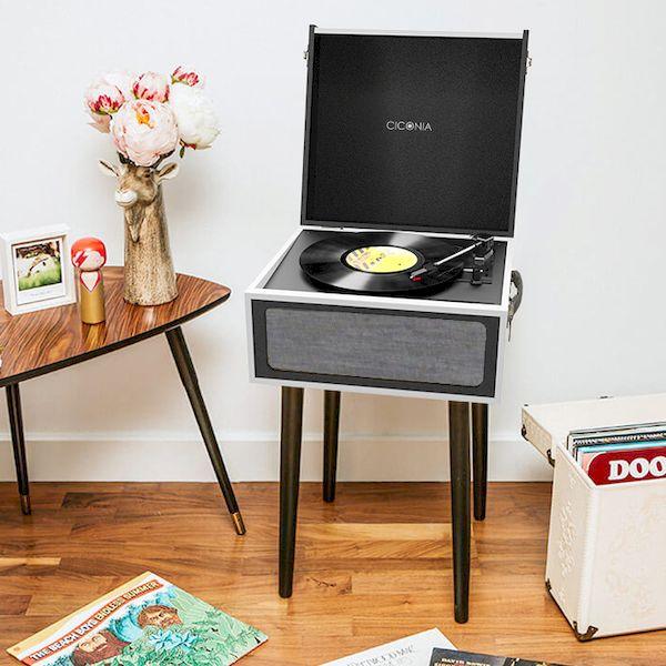 【商品説明】●天板を閉めればテーブルにもなる、レトロでオシャレなレコードプレーヤー。●3スピード(33 1/3、45、78回転)対応。EPアダプターも付属しています。●オートストップ機能付。●Bluetooth対応のスマートフォンやパソコンとワイヤレス接続し、音楽再生可能。●USBメモリー・microSDカード入っているMP3・WAV形式音楽データの再生可能。●レコードの音源をUSBメモリー・microSDカードへの簡単録音可能。●AUX-IN端子、RCA(赤白)端子搭載。●FMラジオ搭載。●スピーカー部定格出力:10W×2消費電力:5W●レコードプレーヤー部モーター:DCモータードライブ方式:ベルトドライブターンテーブルスピード:33 1/3、45、78回転カートリッジ:セラミック圧電方式レコード針:サファイヤレコード針●USB/microSD部再生可能フォーマット:MP3、WAV録音形式:WAV(PHONOモードのみ)録音サンプリング周波数:FMラジオ 32KHz、AUX-IN/Phono 48KHz録音ビットレート:386Kbps対応容量:32GBまで●Bluetooth部バージョン:Ver.4.2対応プロファイル:A2DP同時接続台数:1台●ラジオ部FM周波数:76-108MHz●基本仕様入力端子:AUX-IN(3.5mm径ミニプラグ)AC/DCアダプター接続端子USB/microSDカード端子出力端子:RCA端子(右:赤/左:白)ヘッドホン端子(3.5mm径ミニプラグ)電源入力:AC100V 50/60Hz出力:DC5V 1Aフルオート:機能無しイコライザー:機能ありクォーツ:機能無しSN比:Bluetoothモード SNR45dB-55dBPhonoモード SNR25dB-35dB●寸法幅400×奥行355×高さ610mm(脚接続し、テーブルは閉じた状態で計測)●重量約6.3kg(脚装着時)●付属品EPアダプター、AC/DCアダプター(本機専用)、取扱説明書●注意事項※オートストップ機能は全てのレコードに対応してはおりません。レコードのサイズによって曲の途中で回転が止まる、曲が終わっても回転が止まらない場合がございます。その際は、オートストップ機能をOFFにしてお楽しみください。※録音時、自動的に曲を切り分けたりする機能はありません。音の切れ目に関係なく、録音開始から終了までを1つのファイルとして録音されます。自動的に1曲毎の個別データにはなりませんので、ご注意ください。※ターンテーブルユニットは、モーターの振動をケースに伝えないように、スプリング・マウント構造が採用されており、少し浮いた状態で本体に取り付けられています。不良ではございませんので、予めご了承ください。※テーブルの耐荷重は、約2kgです。テーブルはPUレザーで包まれています。重たい物や、鋭利な物を置くとテーブルに跡が付く場合がございます。テーブル型レコードプレーヤー レトロ クラシック ターンテーブル TE-2015 USBメモリー 多機能 microSDカード 録音 再生 ブルートゥース Bluetooth AUX クラシカルレコードテーブル 3スピード オートストップ プレイヤー CICONIA