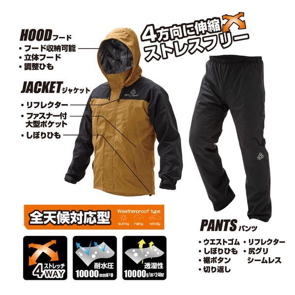 【商品説明】●4方向全てに伸縮するストレスフリーな超軽量ストレッチ透湿レインウェア!●高い 防水力 耐水圧 10,000mmH2O、透湿度 10,000g/平方メートル-24hr●上着は、水の侵入を防ぐ前たて、収納可能な立体フード(調整ひも付)、裾部分には絞りヒモ付で下からの雨・風の侵入をブロックします。●上着の左右両サイドにファスナー付の大型ポケット付(開口部最大26.5cm)●パンツの裾部分ワンタッチボタンで、フィット感を調整可能●ヒップ部分には縫目のないシームレス設計を採用で履き心地を向上●ウエスト部分はゴムと絞りヒモで、脱ぎ履きしやすい!●反射ロゴプリントを上着の左胸部分、背面右上部とパンツの左膝部分に配置し、夜の安全も確保!●縫製部分の裏面には防水テープ(シームテープ加工 )で水の侵入を防ぎます。●上下セット●適用身長(cm):170~175●胸囲(cm):96~104●ウエスト(cm):88~98