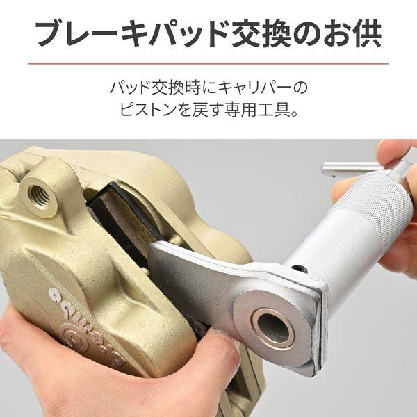 【商品説明】ブレーキパッド交換時にキャリパーピストンを押し戻すための専用工具。ハンドルを回転させるだけで簡単にピストンを戻すことができます。オートバイに最適な薄型のブレードを採用し、さらにブレードを長く伸ばしたことで様々な種類のキャリパーに対応。ハンドルの取り外しが可能なので、コンパクトに収納時可能。 ●ブレード板厚:6mm(片側3mm)●ブレード有効長:36mm●ブレード板幅:30mm●最大開き幅:45mm(内側:39mm)●重量:600g●ハンドル長:80mm●ブレーキパッド交換時にキャリパーピストンを押し戻すための専用工具●ハンドルを回転させるだけで簡単にピストンを戻す●薄型ブレード(厚み6mm)採用で、様々なキャリパーに対応●ハンドルが取り外せることでコンパクト収納●最大開き幅:45mm(内側:39mm)、ブレード板厚:6mm(片側3mm)、ブレード有効長:36mm、ブレード板幅:30mm※ ピストンの戻し機構がネジ式となっているキャリパーには使用できません。