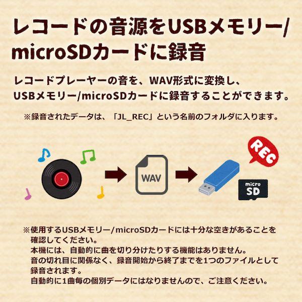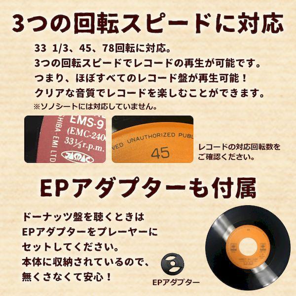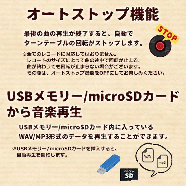 【商品説明】●初心者にもピッタリな、レトロなレコードプレーヤー。●持ち運びに便利なトランクケース型。●3スピード(33 1/3、45、78回転)対応。●オートストップ機能付。●ブルートゥース接続し、外部スピーカーとして使用も可能。●レコードからUSBメモリー/TFカードへの簡単録音可能。●外部機器接続用AUX-IN/RCA端子搭載。●USBメモリー/TFカードに入っているMP3/WAV形式の音楽データ再生可能。●FMラジオ搭載。●スピーカー部定格出力:5W×2●レコードプレーヤー部モーター:DCモータードライブ方式:ベルトドライブターンテーブルスピード:33 1/3、45、78回転カートリッジ:セラミック圧電方式レコード針:サファイヤレコード針●USB/TF部再生可能フォーマット:WAV/MP3音楽再生録音形式:WAV形式録音(PHONOモードのみ)録音サンプリング周波数:FMラジオ32KHz、AUX-IN/Phono48KHz録音ビットレート:386Kbps●Bluetooth部バージョン:Ver.4.2対応プロファイル:A2DP同時接続台数:1台●ラジオ部FM:76-108MHz●基本仕様端子:入力AUX-IN(3.5mm径ミニプラグ)AC/DCアダプター接続端子USB/TFポート出力RCA端子(右:赤/左:白)ヘッドホン端子(3.5mm径ミニプラグ)電源入力:AC100V 50/60Hz出力:DC5V 1A●寸法幅360×奥行260×高さ125mm●重量約3.0kgレコードからUSBメモリー/SDカードへの簡単録音可能!レトロなレコードプレーヤー。