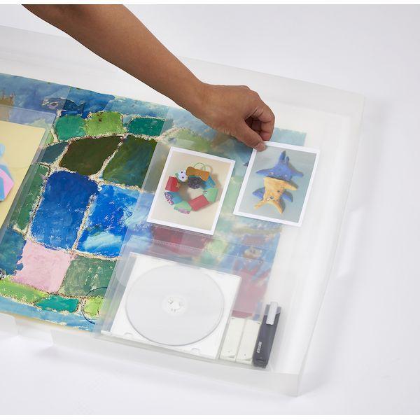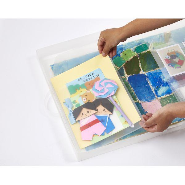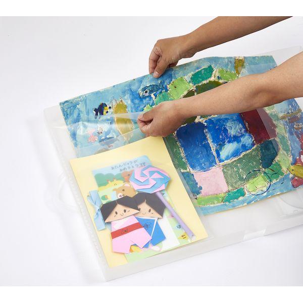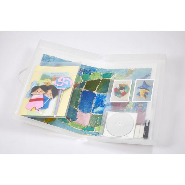 【商品説明】●お子さまの作品をこれ一冊にまとめて保管。●絵画作品ポケット:厚口四ツ切り画用紙(540×380mm)が収納できます。●作品の出し入れガ簡単!左右ポケット間口ガ広く上から出し入れしやすい。絵・書道・版画など。●A4ポケット:A4サイズまでの薄い冊子やカード、折り紙や画用紙などで作られた小さな作品の収納に最適です。落下防止フラップ付き。●A5サイズ:A5サイズまでの写真やメモなどの収納に最適です。●データ保存ポケット:立体作品を撮影して、CD・DVD・USBなどでデータ保存収納。商品仕様商品名:作品ファイル 透明メーカー品番:RS1089TJANコード:4902562500355定価:¥1800(税抜)内容:作品をこれ1冊にまとめて保管。絵画作品ポケット6ポケット付。A4ポケット、A5ポケット付。厚みのあるものも収納できるマチありポケット付。素材:PP PE商品サイズ:W450×H295×D45mmレイメイ 藤井 RF ファイル 作品 保管 収納