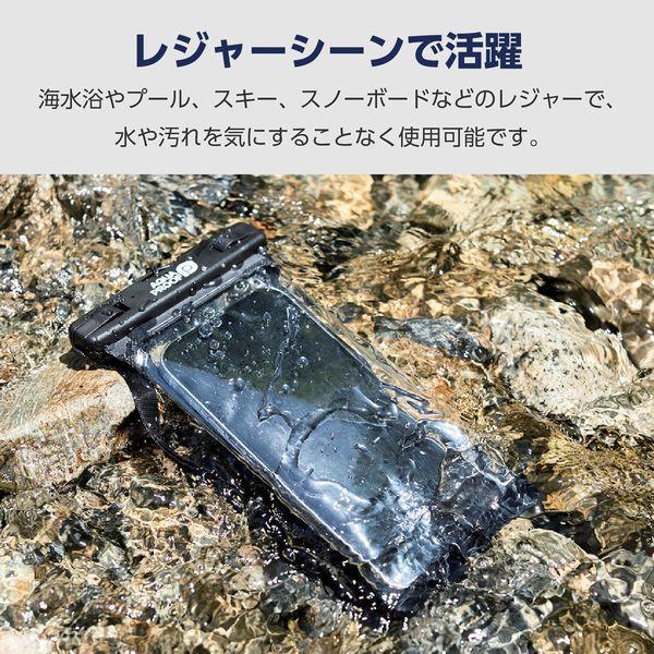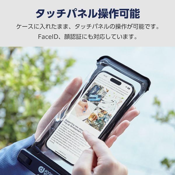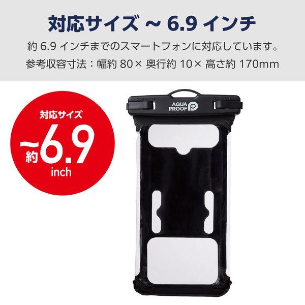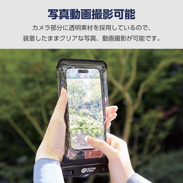【商品説明】●JIS保護等級 IPX8相当の防水性能を実現する、水深10mで30分まで使用可能なスマートフォン用防水ケース“AQUA PROOF”です。●海水浴やプール、スキー、スノーボードなどのレジャーで、水や汚れを気にすることなくスマートフォンを使用可能です。●アームバンド付きなので、ランニングなどのスポーツでの使用にも便利です。●開閉口は出し入れしやすく密封力の高いロックレバータイプです。●サイドボタンが押しやすい操作性抜群の立体構造です。●ケースに入れたまま、タッチパネルの操作が可能です。●ケースを装着したまま動画、音楽鑑賞も楽しめます。●カメラ部分に透明素材を使用しているので、装着したままクリアな写真、動画撮影が可能です。●FaceID、顔認証に対応しています。●持ち運びに便利なネックストラップとアームバンドが付属しています。●約6.9インチまでのスマートフォンに対応しています。●自社環境認定基準を1つ以上満たし、『THINK ECOLOGY』マークを表示した製品です。●環境保全に取り組み、製品の包装容器が紙・ダンボール・ポリ袋のみで構成されている製品です。