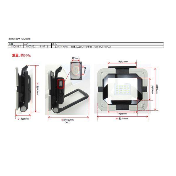 【商品説明】●夜間・暗い場所での作業に●屋外での作業に●防じん・防水等級:IP65●約160°照らす広角仕様●薄型設計:薄さ約55mm、持ち運びやすく収納もコンパクト●連続点灯約6時間 ※LOW設定●場所を選ばず使える●2段階明るさ切替【仕様・規格】●充電時間:最大約3時間(空→フル充電)●使用電球:白色LED(交換不可)●全光束:最大約800lm(Lowモード時)・最大約1600lm(Highモード時)(空→フル充電)※電池が消耗するにつれ明るさも低下します●連続点灯時間:約6時間(Lowモード時)・約2.5時間(Highモード時) ●本体サイズ:約長さ55~150×幅165×高さ165(mm)※長さはブラケットがMin~Maxの時●質量:約0.65kg●設置場所:屋内・屋外●正面照度:約690Lx(High点灯時) (充電アダプター)●定格電圧:AC100V●定格周波数:50/60Hz●出力電圧:DC8.4V●コード長:約1.2m (内蔵バッテリー)●電池種類:充電式リチウムイオン電池 ※交換不可●電圧:DC7.4V●容量:2000mAh●付属品・セット内容 LEDワークライト本体×1 充電アダプター×1 取扱説明書×1