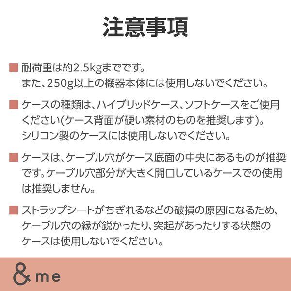 【商品説明】●もっと、自分だけの「好き」を選びたい。そんな想いに応えるアクセサリーで、お気に入りの毎日を。スマートデバイスと私をつなぐ、&meです。 ●雲をモチーフにしたデザインで、クリアのスマホケースに映えるデザインのストラップシートです。 ●お使いのスマホケースにストラップホールがなくても、ケースのケーブル穴に通すだけで使用できます。 ●クリアケースと一緒に使うとかわいいミラーデザインです。 ●お持ちのステッカーで、ケースをデコレーションするときにも生かせる、シンプルでかわいいデザインです。 ●スマートフォンとケースの間に挟むだけでストラップホールを追加できる、1口タイプです。 ●簡単に取り外しができるので、ケースを変えても繰り返し使用が可能です。 ●装着した状態でもイヤホンや充電ケーブルの接続が可能です。 ●約0.6mm厚の薄型シートでケースにフィットする形状です。 ※耐荷重は約2.5kgまでです。また、250g以上の機器本体には使用しないでください。 ●当社製品のスマホショルダーストラップやハンドストラップなど、お好みのストラップとあわせてお使いいただけます。 ●ケースの種類は、ハイブリッドケース、ソフトケースをご使用ください(ケース背面が硬い素材のものを推奨します)。シリコン製のケースには使用しないでください。 ●ケースは、ケーブル穴がケース底面の中央にあるものが推奨です。ケーブル穴部分が大きく開口しているケースでの使用は推奨しません。 ●ストラップシートがちぎれるなどの破損の原因になるため、ケーブル穴の縁が鋭かったり、突起があったりする状態のケースは使用しないでください。 ●バッグやポケットなどからスマホを取り出す際に、ストラップを持って強く引っ張ったり、ねじったりすると、ストラップシートに大きな負荷がかかりちぎれてしまう恐れがあります。取り出す際はまっすぐ取り出してください。 ●ご使用の際は、保護フィルムを剥がしてからお使いください。 ●自社環境認定基準を1つ以上満たし、『THINK ECOLOGY』マークを表示した製品です。 ●環境保全に取り組み、製品の包装容器におけるプラスチック重量を、社内基準製品より20%以上削減した製品です。