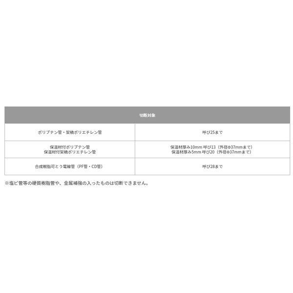 【商品説明】●樹脂パイプをつぶさず、保温材ごと一発で切断できます。●1点切込みのV刃で廻し切り不要です。●スリムな本体で持ち運びに便利 【切断対象】●ポリブテン管・架橋ポリエチレン管:呼び25まで ●保温材付ポリブテン管:保温材厚み10mm 呼び13(外径Φ37mmまで) ●保温材付架橋ポリエチレン管:保温材厚み5mm 呼び20(外径Φ37mmまで) ●合成樹脂可とう電線管(PF管・CD管):呼び28まで ※塩ビ管等の硬質樹脂管や、金属補強の入ったものは切断できません。 【仕様・規格】●サイズ:全長215mm ●製品重量:195g ●材質:アルミダイカスト (本体) / SUS-440 (替刃)