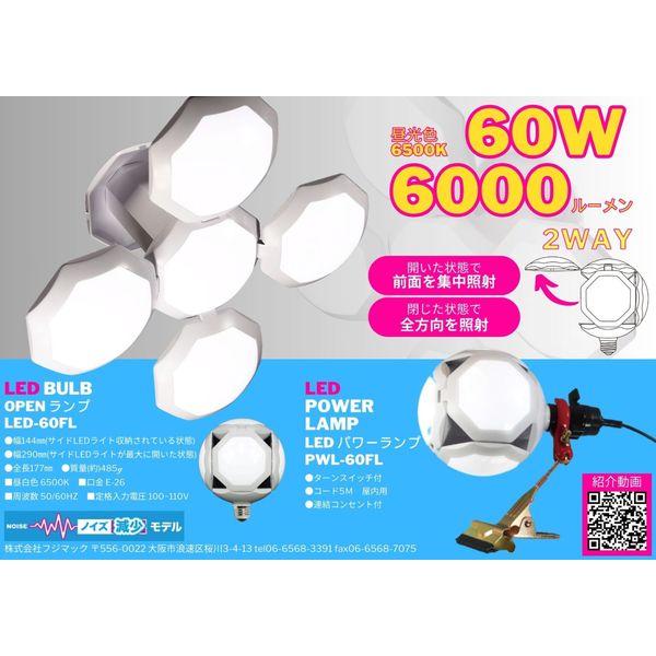 【商品説明】●2WAY:開いた状態で前面を集中照射、閉じた状態で全方向を照射 ●ノイズ減少モデル ●全光束:6000lm 【仕様・規格】 ●サイズ:サイドLEDライトが収納されている状態/全長144mm×幅144mm、サイドLEDライトが最大に開いた状態/全長290mm×幅290mm ●消費電力:60W ●口金:E26 ●周波数:50/60Hz共用 ●電圧:100~110V