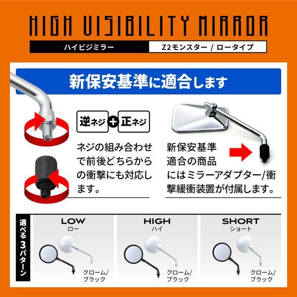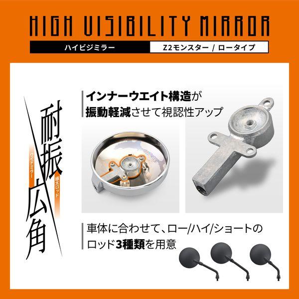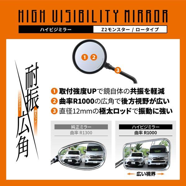 【商品説明】旧車テイストのレトロな雰囲気を放つ丸型ミラー。 耐震性と広角ミラーの組み合わせにより、視認性も確保しています。 鏡内部に亜鉛製の「おもり」を入れることで振動を軽減しミラーのブレを抑制。 直径12mmの極太ロッドを採用し、鏡の取付強度を高くすることで振動の多いバイクにも対応します。 一般的な純正ミラーが曲率R1200-1300に対し、R1000の鏡面を採用しているので、後方視界を広く確保できます。 ●新保安基準適合品 ●タイプ:ロー / ブラック ●サイズ:M10正ネジ ●鏡面にレーザーマーキング入り ●左右共通 片側1本入り ●旧車テイストのレトロな雰囲気を放つ丸型ミラー ●インナーウエイト構造で鏡内部に亜鉛製の重りを採用。振動を軽減し視認性アップ ●直径12mmの極太ロッドを採用。鏡の取付強度を高めて、振動の多いバイクでもミラーがぶれにくい ●R1000の鏡面を採用し、後方視界を広く確保(純正ミラーは曲率R1200-1300) ※本商品は、ワイドミラータイプとなっております。遠近感が純正と異なります。慣れるまで慎重に運転するように心がけてください。 ※適切な後方視界が確保できるようにミラーは左右に取り付け、かつ適正な位置に調整してください。 ※この商品を取り付ける際にM10ボルトの締め付けトルクは車両毎の指定値にて締め付けてください。 ※ミラーハウジング取り付け部分のミラーナットの締め付けトルクは15N・mです。