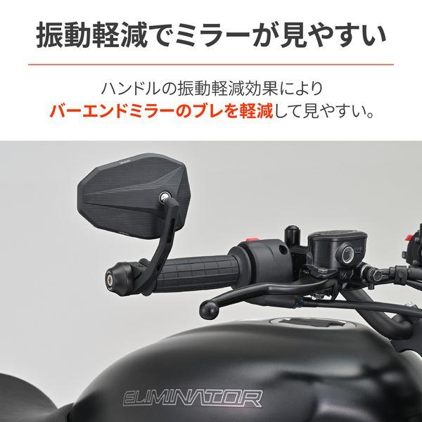 【商品説明】振動軽減ウエイトを内蔵したバーエンドミラーアダプター。 ハンドルの振動を軽減するヘビーウエイトタイプのバーエンドです。 バーエンドミラーの装着が可能で、ハイサイダーのバーエンドミラーに対応。 防振効果によりブレが減少し、ミラーが見やすくなります。 スロットルに干渉しにくい構造で様々な車種に取付可能。 ●振動軽減ウエイトを内蔵したバーエンドミラーアダプター ●ハンドルの振動を軽減して走行中の疲労軽減 ●防振効果によりミラーのブレを抑え、視認性を向上 ●ミラー取付部:φ30、幅7mm ●左右2個セット●スチール製マットブラック塗装仕上げ●ステンレス製ボルト採用 ●カワサキ M8用 / 参考適合車両:Z900RS、Z650RS、Z800、Z900、Z1000 ●重量:片側 約195g ※レバー操作時にバーエンドミラーのアームが接触する場合はレバーホルダーの位置調整が必要です。 ※ハンドル幅が変更されるため車検証の記載変更が必要となる場合があります。