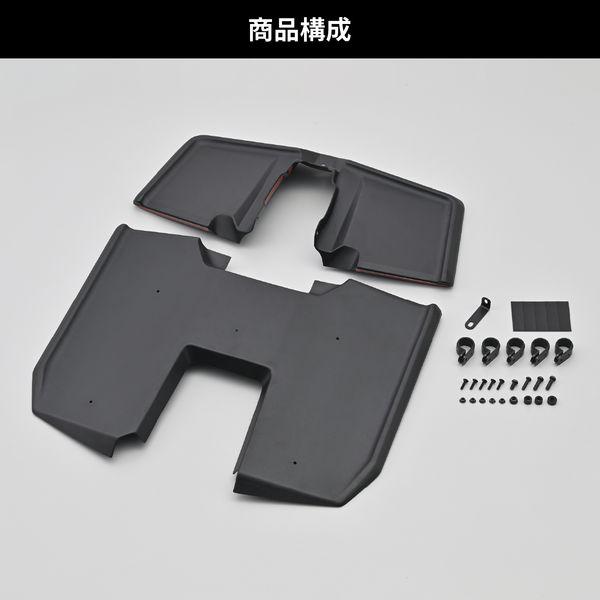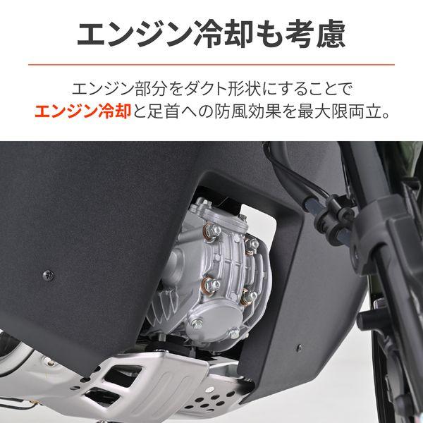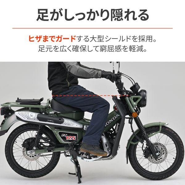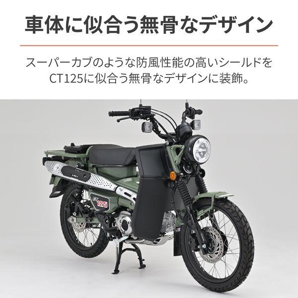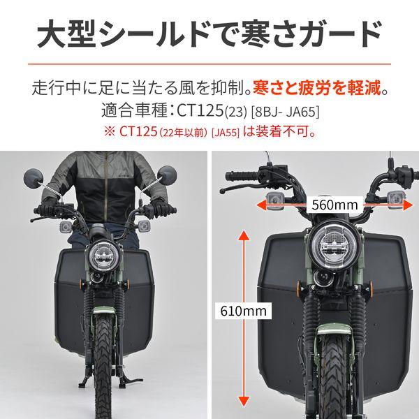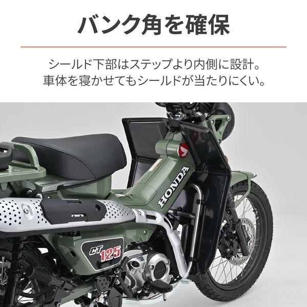 【商品説明】走行時に足に当たる風を抑制し、寒さや疲労を軽減。 エンジン部分をダクト形状にすることでエンジン冷却と足首への防風効果を最大限両立。 フロントタイヤからの泥よけにもなります。 ●大型シールドで寒さガード。虫やフロントからの泥はねも軽減 ●ヒザまで隠れる大型シールドを採用しつつ、足元を広く確保 ●エンジン冷却を考慮して、ダクト形状にデザイン ●スーパーカブのような防風性能をCT125で発揮 ●適合車種:CT125(23) [8BJ-JA65] ※CT125(22年以前) [JA55]は装着不可 ●カラー:マットブラック ●素材:ABS樹脂(厚さ2mm) ●取付方法:ボルト固定と両面テープで簡単取付 ●レッグシールド装着状態で点火プラグ交換が可能です。 ※汚れた場合は、傷のつきにくいやわらかい布と中性洗剤を使用して多量の水で洗い流してください。 ※パイプエンジンガード(品番:33820)との同時装着不可。 ※前面投影面積が大きくなるため最高速が落ちます。 ※傷つきやすいので乾ぶきはしないでください。 ※ガソリンやシンナー等有機溶剤、コンパウンド入りのクリーナー等は使用しないでください。