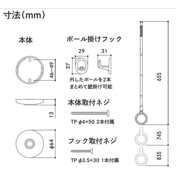 【商品説明】ロングセラーのSPA型を改良し、さらにスマートなデザインとしました。 13mmと薄くなった本体は、天井付近にあっても目立たず内装デザインを損ないません。 ポールの軽量化により、着脱操作もしやすくなっています。 リング付け根には安全性を高める荷重目安ガイド機能を新たに採用しています。 ●天井を守るスプリング機構 ●ポールをしっかりとロック ●手軽にワンタッチ着脱 ●ポールを使いやすい長さに調整。 ●使用しない時はポールをワンタッチで外して、壁掛けフックへ 【仕様】 ●付属品:フック2個、本体用TPネジ(Φ4×50)4本、フック用TPネジ(Φ3.5×30)2本 ●材質:(本体・カバー)亜鉛ダイカス/(ポール)ステンレス/(ポール先端)亜鉛ダイカスト/(リング)ナイロン ●色:BK(ブラック) ●全長(mm):660、750、840(3段階調節) ●許容荷重(kg):(目安)8 ●仕様:ポールは着脱可能、荷重目安ガイド ●注意事項:※水平天井のみに対応します。SPCL-BK