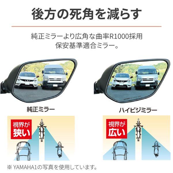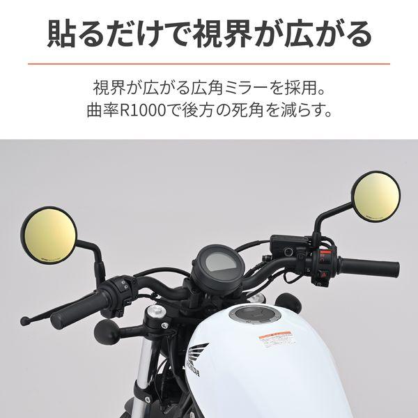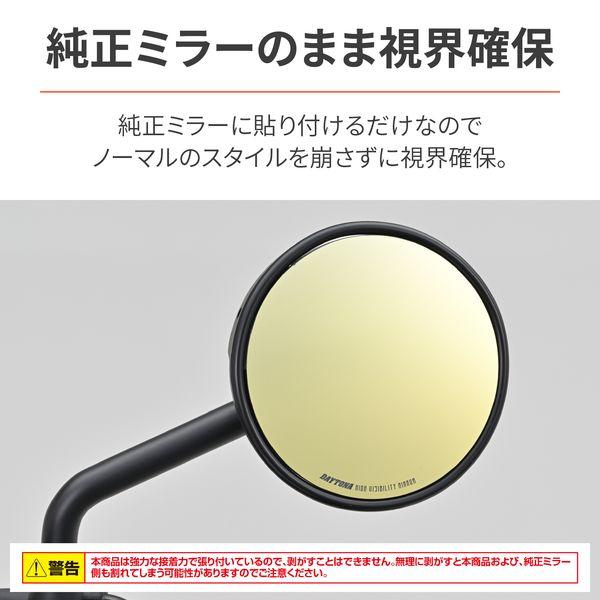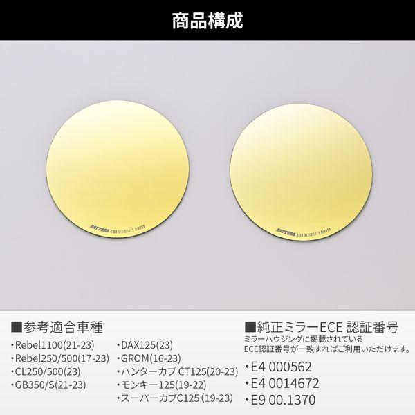 【商品説明】貼るだけで視界が広く、見やすいハイビジミラー。純正よりも視界が広がる曲率R1000の広角ミラーで後方の死角を減らします。早朝や夕暮れの薄暗い時間帯でもコントラストが高くはっきり見えるゴールドミラーを採用。純正ミラーに貼り付けるだけなので、ノーマルのスタイルを崩さずに視界を確保します。ミラーハウジングに掲載されているECE 認証番号が一致すれば、参考適合車種以外の車両にも取付が可能です。●参考適合車種(デイトナ社確認車両):レブル1100(21-23)、レブル250/500(17-23)、CL250/500(23)、GB350/S(21-23)、ダックス125(23)、グロム(16-23)、ハンターカブ CT125(20-23)、モンキー125(19-22)、スーパーカブ C125(19-23)●純正ミラーECE 認証番号:E4 000562 / E4 0014672 / E9 00.1370 に適合●新保安基準適合※本商品は強力な接着力で張り付いているので、剥がすことはできません。無理に剥がすと本商品および、純正ミラー側も割れてしまう可能性がありますのでご注意ください。※本商品はガラス製品のためケガ、割れなどお取り扱いには充分ご注意ください。※気温の低いときの施工は両面テープの接着力が低下しますので、ドライヤーなどで軽く暖めて作業することをおすすめします。※テープの完全接着までは(約24時間程度かかります)水濡れや激しい振動を与えないようにしてください。※車体側ミラーの製造誤差により、本商品との形状にズレが生じることがあります。ズレが生じた場合黒色油性マジックで車体側ミラー枠に沿って塗るとすき間が目立たなくなります。※本商品が車体側にはまらない場合は、車体側ミラーの縁をドライヤーなどで暖めるとはまりやすくなります。※強力両面テープを使用しておりますので、貼り直しはできません。位置決めなど慎重に行なうようにしてください。無理に剥がそうとした際は、ミラーの破損、ケガの恐れがあります。絶対に行なわないでください。※本商品は、ワイドミラータイプとなっております。遠近感が純正ミラーと異なります。慣れるまで慎重に運転するように心がけてください。※ミラーの縁は滑らかになっておりますが手を切ったりしないよう充分ご注意ください。※ミラー用のケミカル類は使用しないでください。