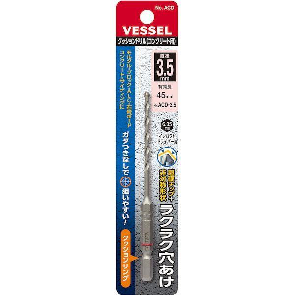 ベッセルメーカーお問い合わせ:0120-999-914【特長】●モルタル・ブロック・レンガ・ALC・石こうボードなどの穴あけ、プラグアンカー挿入やプラグレスビス用の下穴あけに適しています。●振動ドリル不要。充電インパクトでぐんぐん穴あけできます。●非対称の特殊超硬チップ形状。切削スピードは一般形状の4倍以上です。●高負荷に耐えるクロムモリブデン鋼。刃先から六角軸まで一体加工です。【用途】●被削材:コンクリート、モルタル、ブロック、レンガ、ALC、石こうボード。【仕様】●刃径(mm):3.5●有効長(mm):45●全長(mm):102●シャンク径(mm):6.35●シャンク形状:六角軸(6.35mm)●適合機種:エアドライバー(対辺6.35mm)、電動ドライバー【仕様2】●リング色:赤【材質/仕上】●刃部:特殊鋼【注意】●振動ドリル・ロータリーハンマードリルには使用しないでください。【原産国】ベトナム