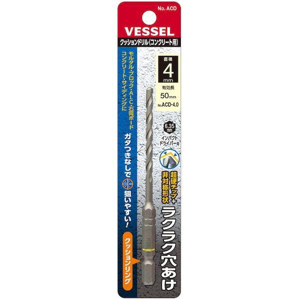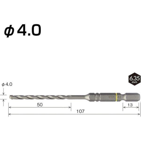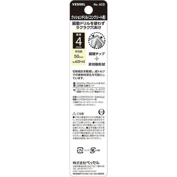 ベッセルメーカーお問い合わせ:0120-999-914【特長】●モルタル・ブロック・レンガ・ALC・石こうボードなどの穴あけ、プラグアンカー挿入やプラグレスビス用の下穴あけに適しています。●振動ドリル不要。充電インパクトでぐんぐん穴あけできます。●非対称の特殊超硬チップ形状。切削スピードは一般形状の4倍以上です。●高負荷に耐えるクロムモリブデン鋼。刃先から六角軸まで一体加工です。【用途】●被削材:コンクリート、モルタル、ブロック、レンガ、ALC、石こうボード。【仕様】●刃径(mm):4.0●有効長(mm):50●全長(mm):107●シャンク径(mm):6.35●適合機種:エアドライバー(対辺6.35mm)、電動ドライバー●シャンク形状:六角軸(6.35mm)【仕様2】●リング色:赤【材質/仕上】●刃部:特殊鋼【注意】●振動ドリル・ロータリーハンマードリルには使用しないでください。【原産国】ベトナム