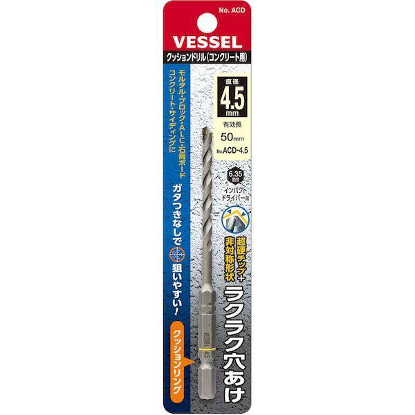 ベッセルメーカーお問い合わせ:0120-999-914【特長】●モルタル・ブロック・レンガ・ALC・石こうボードなどの穴あけ、プラグアンカー挿入やプラグレスビス用の下穴あけに適しています。●振動ドリル不要。充電インパクトでぐんぐん穴あけできます。●非対称の特殊超硬チップ形状。切削スピードは一般形状の4倍以上です。●高負荷に耐えるクロムモリブデン鋼。刃先から六角軸まで一体加工です。【用途】●被削材:コンクリート、モルタル、ブロック、レンガ、ALC、石こうボード。【仕様】●刃径(mm):4.5●有効長(mm):50●全長(mm):107●シャンク径(mm):6.35●適合機種:エアドライバー(対辺6.35mm)、電動ドライバー●シャンク形状:六角軸(6.35mm)【仕様2】●リング色:赤【材質/仕上】●刃部:特殊鋼【注意】●振動ドリル・ロータリーハンマードリルには使用しないでください。【原産国】ベトナム