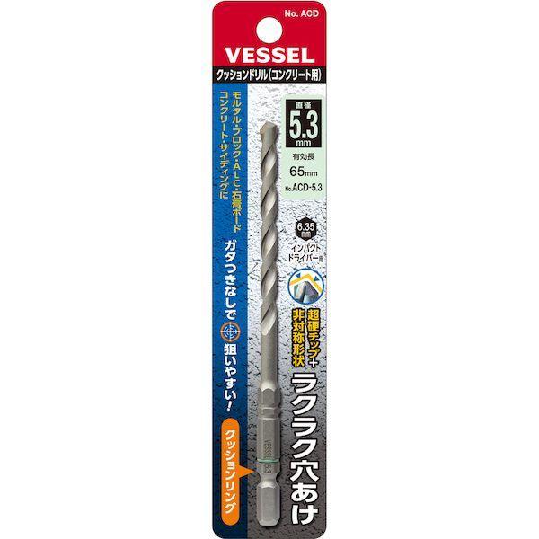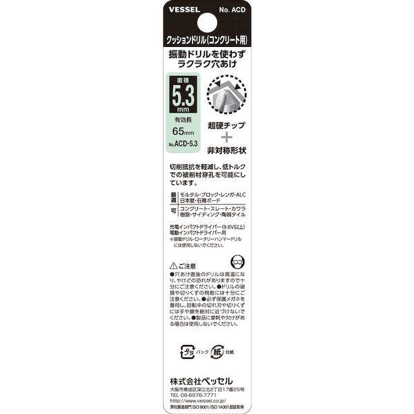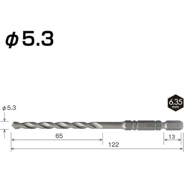 ベッセルメーカーお問い合わせ:0120-999-914【特長】●モルタル・ブロック・レンガ・ALC・石こうボードなどの穴あけ、プラグアンカー挿入やプラグレスビス用の下穴あけに適しています。●振動ドリル不要。充電インパクトでぐんぐん穴あけできます。●非対称の特殊超硬チップ形状。切削スピードは一般形状の4倍以上です。●高負荷に耐えるクロムモリブデン鋼。刃先から六角軸まで一体加工です。【用途】●被削材:コンクリート、モルタル、ブロック、レンガ、ALC、石こうボード。【仕様】●刃径(mm):5.3●有効長(mm):65●全長(mm):122●シャンク径(mm):6.35●シャンク形状:六角軸(6.35mm)●適合機種:エアドライバー(対辺6.35mm)、電動ドライバー【仕様2】●リング色:緑【材質/仕上】●刃部:特殊鋼【注意】●振動ドリル・ロータリーハンマードリルには使用しないでください。【原産国】ベトナム