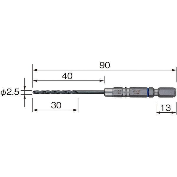 ベッセルメーカーお問い合わせ:0120-999-914【特長】●樹脂リングが芯振れ・ガタつきを抑制し、正確な穴あけを実現します。●芯振れ激減で高速穴あけができます。●食い付き性がよく、ポンチ(ドリルの先端が逃げないように穴の中心を決めるマーキング)が不要です。(効果を発揮するφ3.0mm以上に採用しています。)●高硬度HSS(ハイス鋼)で、鋭い切れ味が持続します。●溝加工したドリルを軸に、プレス絞りで一体化しました。(結合力を高めるため、φ1.8mm以上は2面カットを入れてさらに強化しました。)【用途】●被削材:鉄、軽金属、合成樹脂、木材。【仕様】●刃径(mm):2.5●溝長(mm):30●全長(mm):90●シャンク径(mm):6.35【仕様2】●18Vインパクト対応●6.35mmの六角軸タイプ●X形シンニング(φ3.0mm以上)【材質/仕上】●高速度鋼(HSS)【注意】●穴あけ直後のドリルは高温になり、やけどの恐れがありますので、十分にご注意ください。●加工物はしっかり固定し、ドリルを加工物に対して直角に押し付けてください。●インパクトドライバーでの使用はしないでください。●必ず保護眼鏡を着用してください。●製品に摩擦や欠けがある場合には使用しないでください。【原産国】中国