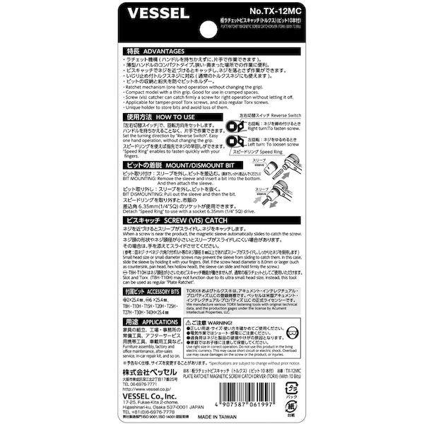 ベッセルメーカーお問い合わせ:0120-999-914【特長】●整備で使用頻度の高い、トルクス[[R下]]ねじ用ビットをそろえたセットです。●ビスキャッチにねじを近づけると強力マグネットでキャッチし、ねじを落とさず片手で作業ができます。【用途】●整備作業に最適。いじり止め付トルクス[[R下]]ねじにも使えます。【仕様】●全長(mm):132【仕様2】●スライドパック入●ビット全長:25.4mm【材質/仕上】●ビット:クロムバナジウム鋼【セット内容/付属品】●6.35mmビット(ホルダケース付)スピードリング●ビスキャッチ付板ラチェット●T8H・T10H・T15H・T20H・T25H・T27H・T30H・T40H・[[+]]2・[[-]]6【原産国】台湾