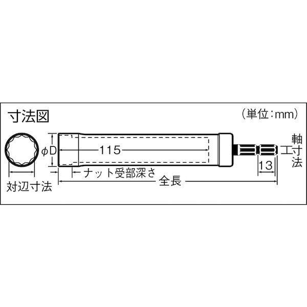 ベッセルメーカーお問い合わせ:0120-999-914【特長】●ダクト取り付け・吊りボルト・中空セメントハンガー取り付け用です。●軸圧入式(特許)で抜け・ねじれに強いです。●面接触型12角でナットに差し込みやすいです。●ボルト出代が長い場合のナット締めに便利です。【用途】●ダクト取り付け・吊りボルト・中空セメントハンガー取り付けなどに。【仕様】●軸寸法(mm):6.35●全長(mm):160●対辺寸法(mm):19●ナット受部深さ(mm):10【仕様2】●12角面接触●Dφ(mm):25●18Vインパクト対応【材質/仕上】●クロムバナジウム鋼(Cr-V)【原産国】日本