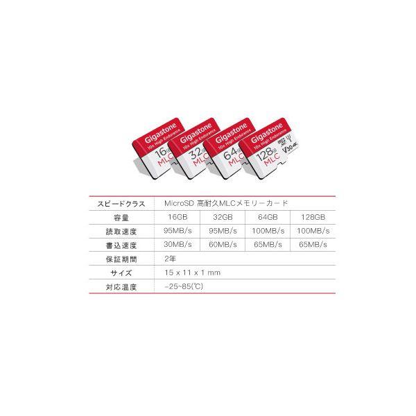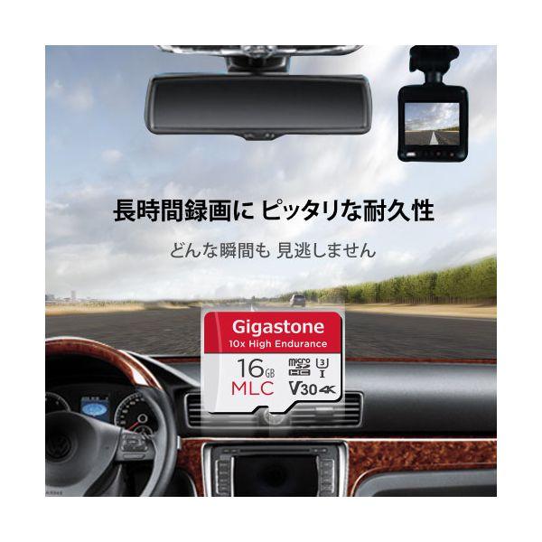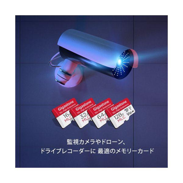 【商品説明】●GigastoneのmicroSDカードは、高品質のNAND フラッシュと高性能コントローラを採用し、お客様に安定した性能を提供致します。また、厳しいご使用環境を想定した耐久試験を実施しております。●ドラレコ・防犯カメラ・ドライブレコーダー・監視カメラ・カーナビなど繰り返し書き込みに強いMLC NAND搭載、防水仕様