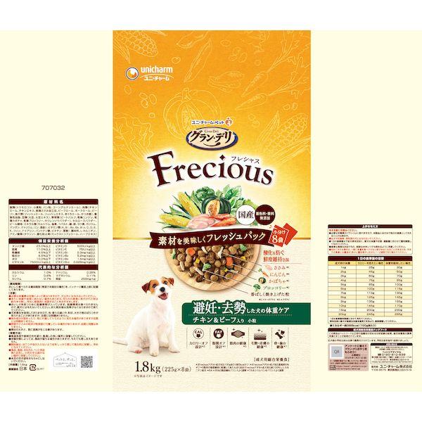 【商品説明】●できたて鮮度の香りと素材の美味しさが実感できる国産プレミアムドッグフードです。●<カロリーオフ設計>100gあたり約5kcalオフ* ※フレシャス アダルト成犬用比●<糖質オフ設計>脂質約5%オフ* ※フレシャス アダルト成犬用比●<避妊・去勢した犬の体重ケア>筋肉の健康維持に配慮して高たんぱく設計(約105%)。L-カルニチン配合●<毛艶・皮膚の健康>オメガ6&3脂肪酸をバランスよく調整●<骨・歯の健康>カルシウム・リンをバランスよく調整●<健康維持により、免疫力維持をサポート>ビタミンEを配合●<健康な便>食物繊維たっぷりの素材を配合●原材料:穀類(トウモロコシ、小麦粉、パン粉、コーングルテンミール)、肉類(チキンミール、チキンエキス、乾燥ささみ加工品、ビーフミール、ポークミール、ビーフ)、魚介類(フィッシュミール、フィッシュエキス、まぐろミール、かつお節)、動物性油脂、豆類(大豆、大豆エキス)、野菜類(ビートパルプ、乾燥ニンジン、乾燥カボチャ、乾燥ブロッコリー、ホウレンソウパウダー)、セルロースパウダー、ビール酵母、ミネラル類(カルシウム、塩素、コバルト、銅、鉄、ヨウ素、カリウム、マンガン、ナトリウム、リン、亜鉛)、ビタミン類(A、B1、B2、B6、B12、C、D、E、K、コリン、ナイアシン、パントテン酸、ビオチン、葉酸)、調味料、L-カルニチン、アミノ酸類(タウリン)、酸化防止剤(ミックストコフェロール、ハーブエキス)●保証成分:タンパク質23.0%以上、脂質11.0%以上、粗繊維4.5%以下、粗灰分8.5%以下、水分10.0%以下●エネルギー:約365kcal/100g●給与方法:必要な栄養素がバランスよく取れますので、本製品と水のみで毎日の食事として与えることができます。幼犬や妊娠期・授乳期の犬には与えないでください。愛犬の体重や状態、運動量に合わせて量を調整して与えてください。食事は清潔なお皿で与え、新鮮な水をいつでも飲めるように用意してください。初めて与える場合は、一度に多量を食べさせると便がゆるくなることがあるため、今までの食事に少量混ぜ、徐々に量を増やしながら、1~2週間で切り替えてください。●保管方法:高温多湿や直射日光を避け、風通しの良い場所に保管してください。保管状態によっては風味が落ちる場合がありますが、与えても差し支えありません。開封後は、ほこりや虫が入らないよう封をしっかり閉じて衛生的に保管し、早めに与えてください。食品、食器、おもちゃ、ペット用品等と区別し、小児の手の届かない場所に保管してください。本品の空き袋をおもちゃにしないでください。●賞味期限:540日●原産国または製造地:日本●諸注意:必要な栄養素は生物によって異なりますので、犬以外には与えないでください。まれに体調や体質に合わない場合もあります。何らかの異常に気づかれたときは給与を中断し、早めに獣医師に相談することをおすすめします。おいしさを保つために脱酸素剤が入っています。脱酸素剤は食べられませんので、愛犬には与えないでください。また、開封後は効果がなくなりますので、捨ててください。天然素材を使用しておりますので、色・香りの違いや、形状、大きさ等のばらつきが見られることがありますが、品質には問題ありません。旨み成分が固まったり、粒に付着してシミのように見える場合がありますが品質には問題ありません。野菜やささみの粉末が粒表面に付着している場合がありますが、品質に問題ありません。素材の大きさ、数に差異が生じる事があります。犬 プレミアムフード ドライ 小分け 避妊 去勢
