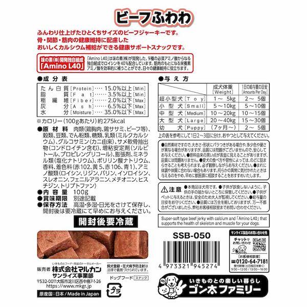 【商品説明】●ふんわり仕上げたひとくちサイズのビーフジャーキーです。●骨、関節、筋肉の健康維持に配慮したおいしくカルシウム補給ができる健康サポートスナックです。●原材料:肉類(鶏胸肉、鶏ササミ、ビーフ等)、穀類、豆類、でん粉類、糖類、乳類(ミルクカルシウム)、グルコサミン(カニ由来)、サメ軟骨抽出物(コンドロイチン含む)、増粘安定剤(ソルビトール、プロピレングリコール)、膨張剤、ミネラル類(塩化ナトリウム)、ポリリン酸ナトリウム、香料、着色料(赤102、黄5、赤106、青1)、アミノ酸類(ロイシン、リジン、バリン、イソロイシン、スレオニン、フェニルアラニン、メチオニン、ヒスチジン、トリプトファン)●保証成分:たん白質15.0%以上、脂質3.5%以上、粗繊維2.0%以下、灰分6.5%以下、水分35.0%以下●エネルギー:約275kcal/100g●給与方法:パッケージ記載の表を参考にして1日2~3回に分け、おやつとしてお与えください。●保管方法:高温、多湿、日光をさけて保存し、開封後は早めにお与えください。●賞味期限:365日●原産国または製造地:日本●諸注意:本商品は犬用です。子供が誤食しないように、子供の手の届かないところに保管して下さい。子供がペットに与えるときは、安全のため大人が監視してください。給与量の目安をお守りください。自然の素材ですので、多少色の異なる場合がありますが、品質には問題がございませんので、安心してお与えください。原料由来の黒い点が表面に見られることがありますが、品質には問題ありません。愛犬の食べ方や習性によっては、のどに詰まらせることも考えられます。必ず観察しながらお与えください。まれに体調や体質に合わない場合もあります。早めに獣医師に相談することをおすすめいたします。犬 スナック 骨 関節 筋肉 ジャーキー