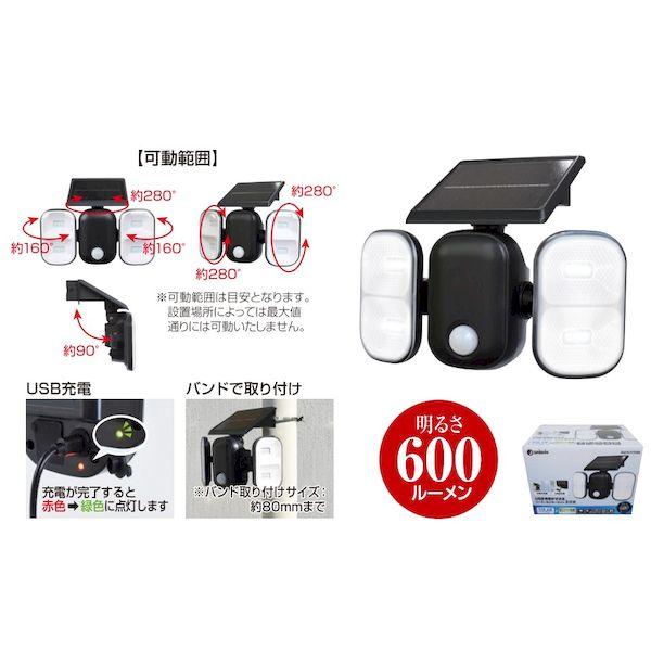 【商品説明】●電源不要のソーラー充電式センサーライト。付属USBケーブルを使用してのUSB充電もできるので日照時間の短い冬場や太陽の当たらない場所での使用も可能です。●センサーが人の動きを感知して、自動で点灯。防雨構造で雨の当たる場所への設置も可能。玄関・ガレージ・ベランダなどの照明や防犯におすすめです。