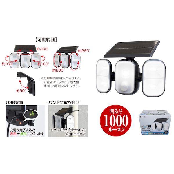 【商品説明】●電源不要のソーラー充電式センサーライト。付属USBケーブルを使用してのUSB充電もできるので日照時間の短い冬場や太陽の当たらない場所での使用も可能です。●センサーが人の動きを感知して、自動で点灯。防雨構造で雨の当たる場所への設置も可能。玄関・ガレージ・ベランダなどの照明や防犯におすすめです。