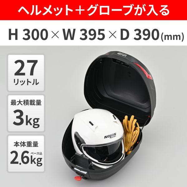 【商品説明】容量27リットルのモノロックケース。フルフェイスヘルメット1つと小物が収納できるコンパクトサイズ。蓋を閉めるだけでロックができるプッシュダウンクローズシステムを採用。シェルには、丈夫で長持ちし時間が経っても色あせしにくいGIVI独自開発素材の「テクノポリマー」を使用しています。モノロック用の汎用ベース付属。●バイク用リアトップケース(モノロック) ●コンパクトでヘルメット1個と小物が入るサイズ ●商品構成:ボックス本体、汎用モノロックベース ●ボックス外寸:奥行390mm×幅395mm×高さ300mm ●総重量(ベースプレート込み):2.6kg ●容量:27L ●最大積載重量:3.0kg ※ キャリア本体の積載制限以上は積載しないでください。※ 防水性を考慮した設計をしておりますが、完全防水ではありません。※ レンズ部に防水性はありません。※ 構造上カギの閉じ込み(インロック)ができてしまいます。十分ご注意してください。※ 商品の仕様上、上下ボタンの押し込み具合は渋め(深め)です。ケースを手でささえながらボタンを奥までしっかり押し込み、確実な操作を行なってください。※ 商品の仕様上、カギの挿入方向にご注意ください。正しい方向で挿入しないと、ボタンとカギが接触します。※ 商品付属の汎用ベース、またはM6M(別売り)専用。M5M/MM(別売り)はベースラバーが接触しないため、本品には使用しないでください。