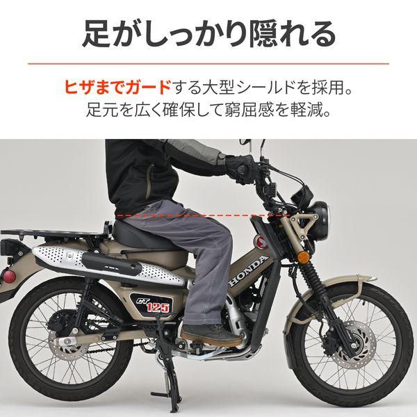 【商品説明】走行時に足に当たる風を抑制し、寒さや疲労を軽減する大型のレッグシールド。エンジン部分をダクト形状にすることでエンジン冷却と足首への防風効果を最大限両立。フロントタイヤからの泥よけにもなります。●大型シールドで寒さガード。虫やフロントからの泥はねも軽減 ●ヒザまで隠れる大型シールドを採用しつつ、足元を広く確保 ●エンジン冷却を考慮して、ダクト形状にデザイン ●スーパーカブのような防風性能をCT125で発揮 ●カラー:マットブラック ●素材:ABS樹脂(厚さ2mm) ●取付方法:ボルト固定と両面テープで簡単取付 ●レッグシールド装着状態で点火プラグ交換が可能です。【適合車種】CT125(20-22) [JA55]※ 汚れた場合は、傷のつきにくいやわらかい布と中性洗剤を使用して多量の水で洗い流してください。※ 傷つきやすいので乾ぶきはしないでください。※ ガソリンやシンナー等有機溶剤、コンパウンド入りのクリーナー等は使用しないでください。※ パイプエンジンガード(品番:97016/18960)は同時装着不可。※ 前面投影面積が大きくなるため最高速が落ちます。