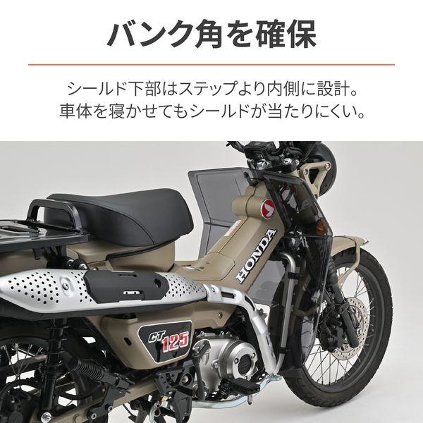 【商品説明】走行時に足に当たる風を抑制し、寒さや疲労を軽減する大型のレッグシールド。エンジン部分をダクト形状にすることでエンジン冷却と足首への防風効果を最大限両立。フロントタイヤからの泥よけにもなります。●大型シールドで寒さガード。虫やフロントからの泥はねも軽減 ●ヒザまで隠れる大型シールドを採用しつつ、足元を広く確保 ●エンジン冷却を考慮して、ダクト形状にデザイン ●スーパーカブのような防風性能をCT125で発揮 ●カラー:スモーク ●素材:耐衝撃アクリル(厚さ2mm) ●取付方法:ボルト固定と両面テープで簡単取付 ●レッグシールド装着状態で点火プラグ交換が可能です 【適合車種】CT125(20-22) [JA55]※ CT125(23年以降) [JA65]は装着不可。※ 汚れた場合は、傷のつきにくいやわらかい布と中性洗剤を使用して多量の水で洗い流してください。※ 傷つきやすいので乾ぶきはしないでください。※ ガソリンやシンナー等有機溶剤、コンパウンド入りのクリーナー等は使用しないでください。※ パイプエンジンガード(品番:97016/18960)は同時装着不可。※ 前面投影面積が大きくなるため最高速が落ちます。