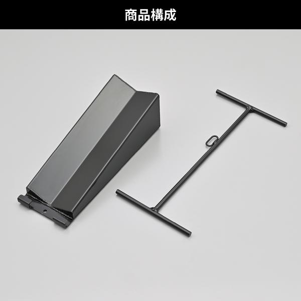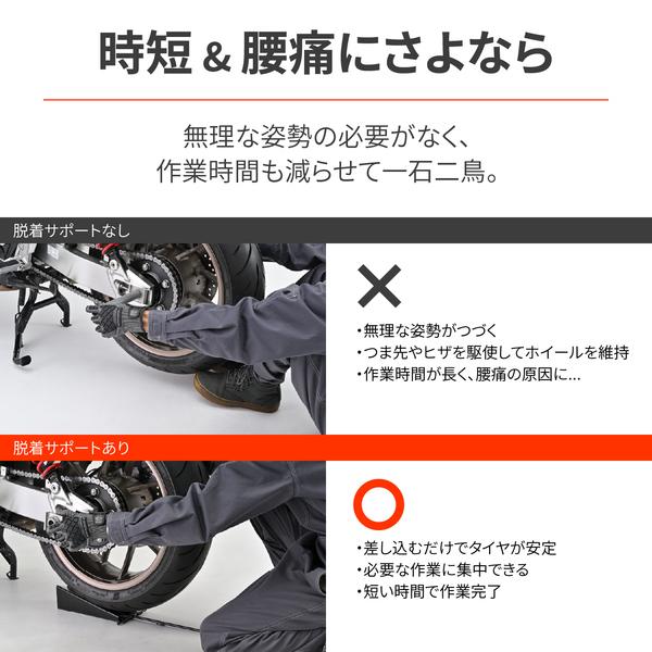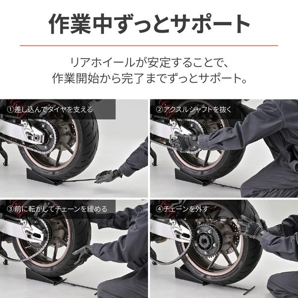 【商品説明】アスクルシャフトをスムーズに脱着できるリアホイールのサポート工具。バイクのリアホイール脱着時、無理な姿勢での作業で苦労していませんか。この脱着サポートをリアホイールの下に差し込むことで、タイヤを自力で保持する必要がなく無理なく作業が完了。シャフトが外れたら、ホイールはスロープを転がして脱着ができます。ホイールを保持しながらアスクルシャフトを抜いたり外したりしてプラスチックハンマーで叩くことなく楽に作業ができます。・タイヤを外す場合リアスタンドまたはセンタースタンドをかけ、ホイール前方から脱着サポートをクサビのようにタイヤの下へ差し込む。付属の補助バーを脱着サポートのフックに掛け、軽く引いてタイヤの座りをよくする。水平に保たれたアクスルシャフトを抜く。前にホイールを押してチェーンをゆるめる。スプロケットからチェーンを外す。チェーンを外した後、ホイールを後ろに転がす。・タイヤを付ける場合タイヤを脱着サポートのスロープに上らせチェーンを掛ける。補助バーを左右前後に動かし、アスクルシャフト穴を調整する。シャフト穴にアスクルシャフトを通す。通らない場合、キャリパーブラケトを動かして微調整し通り芯を出す。アスクルナットでタイヤを固定する。・本体:全長250×幅100×高さ80/板厚1.6(mm)、補助バー:全長310mm/Φ8・スチール製黒塗装仕上げ●リアホイール脱着時のサポート工具●タイヤを自力で保持する必要がなく、無理な姿勢での作業が不要●アスクルシャフトの穴の位置を簡単に調整●脱着サポートの傾斜を利用し、ホイールの持ち上げ不要●本体:全長250×幅100×高さ80/板厚1.6(mm)、補助バー:全長310mm/Φ8※ センタースタンドかリアスタンドで、リアホイール(タイヤ最下部)を最低3-5cm程度浮かす必要があります。※ リアホイール脱着サポートに車重を載せるような使い方はしないでください。