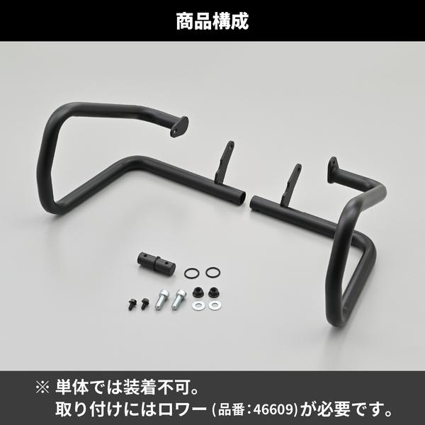 【商品説明】横への張り出しが少ないフレームワークのパイプエンジンガード。転倒時の車両のダメージを軽減。車体の全体イメージを損なわないコンパクト設計。目立たないマットブラック塗装済み。メインパイプはφ25.4パイプで軽度な転倒時にガソリンタンク周りを保護し、ダメージを最小限にします。MADE IN JAPAN。【適合車種】Vストローム250/ABS(17-23) [2BK-DS11A / 8BK-DS12E]・左右セット●適合車種:Vストローム250/ABS(17-23)●軽度な転倒時にガゾリンタンク周りを保護し、ダメージを最小限に●大きく外側へ張り出さない仕様で、装着してもスタイリッシュで目立ちにくいデザイン●全体のイメージを損なわないコンパクト設計●別売の Lower(品番:46609)との同時装着が必要。本品単体での取付不可適合モデル:Vストローム250/ABS(17-23) [2BK-DS11A / 8BK-DS12E]※ 樹脂パッド(リダクションスライダー)は付属しません。※ Upper(品番:46598)は単品装着不可。別売のLower(品番:46609)との同時装着が必要。※ 社外品EXパイプに交換した場合、干渉することがあります。(SP TADAO社「Power Box PIPE」は同時装着が可能です。)