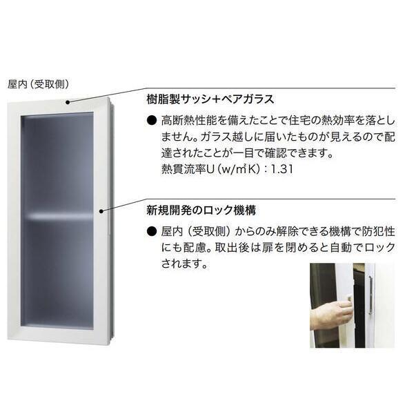 【商品説明】●特徴:大型郵便物対応ポストと宅配ボックスが一体になった貫通配達ユニットは、封筒や手紙などの郵便物、メール便、宅配便の荷物や書留郵便など、これ1台でまとめて受け取れます。悪天候の日や休日のお化粧前でも、家から出ずに郵便物や荷物が受け取れます。扉を開けなくても届いた荷物を確認できます。また屋内側受取扉には覗き込み防止のため光拡散効果のある型ガラスを採用しております。独自開発のロック機構を備えているため、キーや暗証番号は不要です。不在時でも荷物の受け取りができるよう、扉の内側に印鑑ケースが