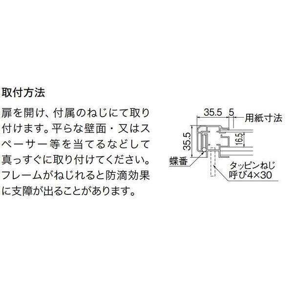 【商品説明】●特徴:屋外でも屋内でも使用できます。パッキン付で防滴型です。マグネットが使用できます。取付方法:扉を開け、付属のねじにて取り付けます。平らな壁面・又はスペーサー等を当てるなどして 真っすぐに取り付けてください。フレームがねじれると防滴効果に支障が出ることがあります。●掲示可能最大用紙寸法(W×H):B2(515×728)●色:ホワイト●材質:枠:アルミ二ウム/掲示面:鉄複合板●仕上:枠:アルマイト処理/掲示面:アクリル焼付塗装<
