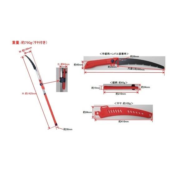 【商品説明】●特長●高い枝にも楽々届く●約2mまで届く ※身長約160cmの人の場合●繊維の方向に関わらずスムーズに切れる刃形状●U窓効果で効率よく木くずを排出●用途に応じて刃の付け替え可能 手鋸用ハンドル付き●防ヤニ:フッ素コート●速切:カーブ刃●永切:衝撃焼入●仕様、規格●サイズ 全長1425mm●製品重量 816g●切断推奨サイズ:約135mm以下●刃部材質:SK-85●のこ板厚: