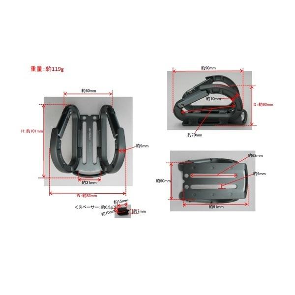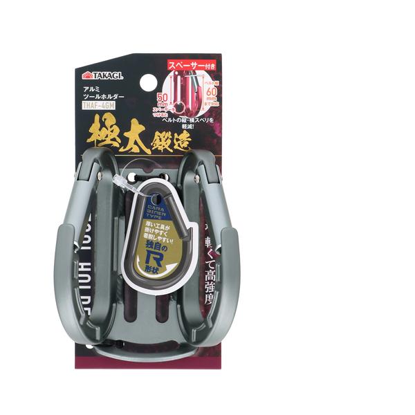 【商品説明】●特長●工具の保持に●独自形状のカラビナでスムーズに工具が脱着できます。●付属スペーサーでベルト通し幅が調整でき、縦・横滑りを軽減。●仕様、規格●カラー ガンメタ●サイズ(W)×(H)×(D)mm 83×99×60●重量(g) 118●材質/本体:アルミ合金 スペーサー:熱可塑性ゴム●ベルト幅60mmまで対応●工具重量3kg以内(登山用ではありません)●セット内容 スペーサー2個