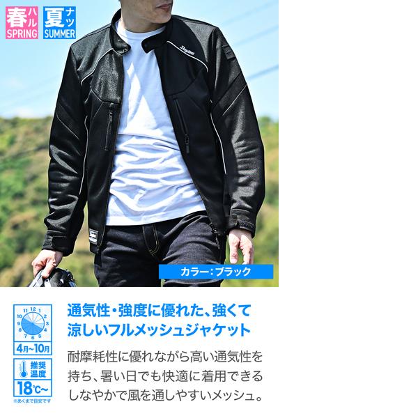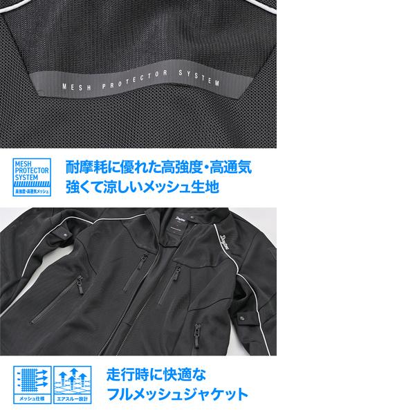 【商品説明】耐久性の課題を解決した高強度メッシュ採用の長持ちするメッシュジャケット。一般的なメッシュジャケットは耐久性に課題があると考え、通気性と強度を両立した「高強度・高通気メッシュ」を採用しました。通気性に優れたメッシュ生地はしなやかで、涼しい風をジャケット内に取り込みます。圧迫や摩擦抵抗を少なく運動機能をあげるように計算されたデイトナオリジナルパターンで製造。体の動きを妨げず、ライディングに適した着心地のよい一着に。CE規格をクリアしたソフトプロテクターを「肩、ひじ、背中、胸」に標準装備。●シーズン:春夏●高強度メッシュにより、耐久性の課題を解決した長持ちするメッシュジャケット●デイトナが考えるオリジナルパターンにより、乗車姿勢を保ちやすい快適な着心地を実現●反射素材のパイピングが夜間の視認性を向上●ソフトプロテクターは全てCE規格クリア(背中、肩、ひじ、胸:Lv1)
