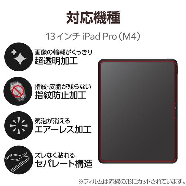 【商品説明】●13インチiPad Pro(M4)の液晶画面を傷や汚れから守る、指紋防止・超透明タイプの液晶保護フィルムです。●つやのある超透明加工により、画像の輪郭がくっきり見えます。●指紋汚れを付きにくくする指紋防止コーティングを施しています。●ハードコート加工により、フィルム表面の傷を防止します。●時間の経過とともに気泡が目立たなくなる特殊吸着層を採用したエアーレスタイプです。●小さな気泡ができたときには、指などで押し出すことで気泡を抜くことができます。●フィルムを貼ったままでも本体操作ができるタッチスクリーン入力に対応しています。●貼り付け面にシリコン皮膜をコーティングし、接着剤や両面テープを使わずに貼り付け可能な自己吸着タイプです。貼りやすく、貼り直しも可能です。●端末の形状に合わせたサイズにカット済みなので、パッケージから取り出してすぐに使用可能です。●貼り付けの際ズレ防止の固定シールが付いており、位置決めが簡単。貼り付け面はセパレートカット構造のため貼り付け易い加工になってます。※フィルムを画面に貼り付けると薄く痕が残ったように見えますが、時間がたつと目立たなくなります。●フィルムがキレイに貼れる専用ヘラと、クリーニングクロス、ホコリ取りシールが付属しています。●自社環境認定基準を1つ以上満たし、『THINK ECOLOGY』マークを表示した製品です。●環境保全に取り組み、製品の包装容器が紙・ダンボール・ポリ袋のみで構成されている製品です。