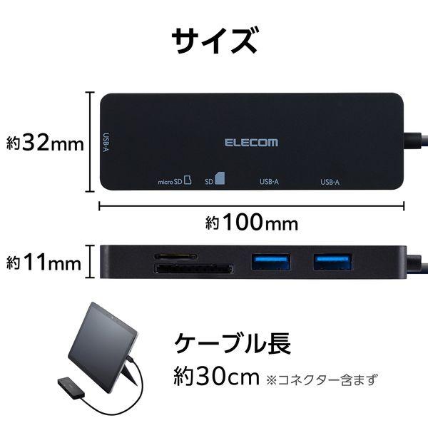 【商品説明】●USBハブにSDカードスロットをプラス。USB 5Gbps(USB3.1(Gen1))対応のUSBマルチハブです。●USB-Aポート3つとSDカードスロット・microSDカードスロット各1つを搭載。周辺機器の使用やファイルの同期や共有、転送ができます。●USB-Aポート2つをフロント、1つをサイドに、SDカードスロット・microSDカードスロットをフロントに配置。幅広の周辺機器を接続するのに便利です。●機能を絞った厚さ約11mmの薄型設計で、在宅ワークや出張、旅行の持ち運びにも便利です。●パソコン本体と接続するUSB Type-C(TM)コネクターと、周辺機器を接続するUSB-Aポートは、最大5Gbps(USB3.1(Gen1))に対応。USB2.0の10倍の速度での高速データ転送が可能です。 ※理論値※USB 5Gbps(USB3.1(Gen1))でご使用になるには、機器側がUSB 5Gbps(USB3.1(Gen1))に対応している必要があります。●USB2.0への先方互換が可能で、USB2.0対応のパソコン・機器でもそのまま接続可能です。●SDXC/SDHCに対応したSDカードスロットとmicroSDカードスロットを搭載しています。●UHS-I対応で高速データ転送が可能。大容量データも素早く手軽に扱えます。ファイルの同期や共有、転送の際にも便利です。※著作権保護機能には対応しておりません。●ACアダプター不要のバスパワー専用タイプです。●パソコン本体との接続は供給電流が大きいUSB Type-Cコネクター接続で、複数の機器をつないでも安定した動作を実現します。●USB Type-Cコネクターは、裏、表に関係なく両面で挿すことが可能です。●ケーブルは紛失の心配がない直付けタイプで、ケーブル長は取り回しのしやすい約30cmです。●本製品はUSBポートを増設するための製品です。本製品を使用してスマートフォン・タブレットを充電することはおすすめできません。※USB Type-C and USB-C are trademarks of USB Implementers Forum●自社環境認定基準を1つ以上満たし、『THINK ECOLOGY』マークを表示した製品です。●環境保全に取り組み、製品の包装容器におけるプラスチック重量を、社内基準製品より20%以上削減した製品です。●環境保全に取り組み、製品の包装容器が紙・ダンボール・ポリ袋のみで構成されている製品です。●廃棄物削減に取り組み、製品に同梱する取扱説明書等をペーパーレス化した製品です。USB Type-C ハブ USB3.1 Gen1 USB-A×3 SD+microSD×1 バスパワー 薄型 TypeC 機器対応 ケーブル約30cm ブラック U3HMSD3007BBK