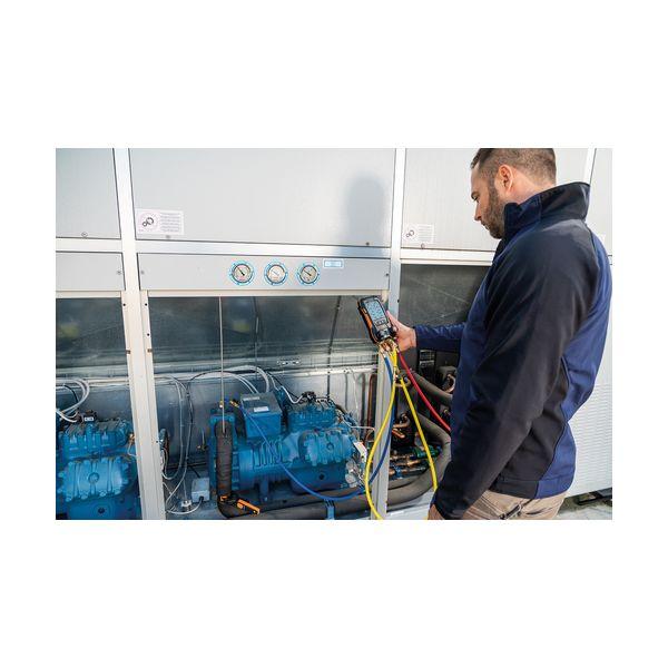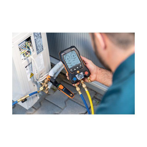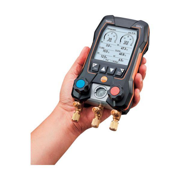 【商品説明】【特長】●2バルブ式デジタルマニホールド testo 550sは、バックライト付き大型ディスプレイ、防塵防水の堅牢ボディ、高度な測定メニューと演算機能を搭載しています。●Bluetoothでスマホ/タブレットと接続すると、アプリで測定結果をさらに高精細に表示できるだけでなく、測定データの記録、レポート作成、メール送信が可能です。●優れた操作性と耐久性で、エアコン・冷凍機の試運転・サービス・メンテナンスの時間短縮と効率化を実現します。●防塵防水 (IP54)があり、コンパクト&堅牢ボディです。●簡単操作やグラフィッ【用途】●冷凍空調装置の冷媒管理●ヒートポンプの冷媒管理【仕様】●接続口径: 1/4インチフレア × 3●測定圧力(MPa):-0.1~+6●圧力レンジ(MPa):-0.1 ~ 6.0●最小目盛(MPa):0.001【仕様2】●測定範囲: ゲージ圧 -0.1~+6 MPa、温度 -40~+150 ℃●耐圧:+6.5MPa●演算項目: 飽和温度 (蒸発温度・凝縮温度)、過熱度・過冷却度●対応冷媒: R32・R410A・R22・R407Cなど約90種【材質/仕上】【セット内容/付属品】●testo 550s × 1●testo 115i(無線) × 2●異径アダプタ × 3●専用ケース【注意】
