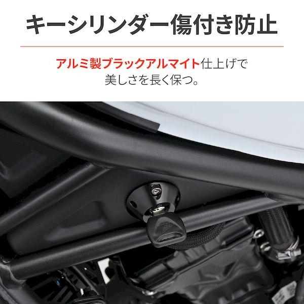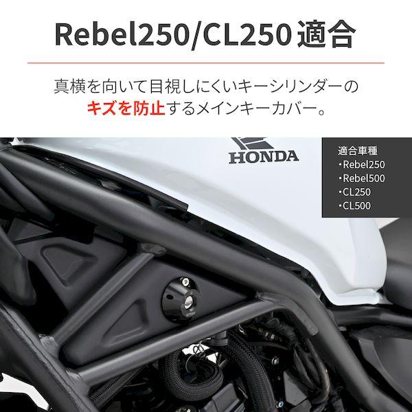 【商品説明】暗闇でもメインキーが差しやすくなるメインキーカバー。純正のキーシリンダーは横向きのため乗車状態でキー穴が見えず、鍵先でキーシリンダ上面を傷だらけにしていまい、ゴム製のキーカバーは経年劣化すると変色してしまう。キー挿しこみ口がテーパー上の本商品を装着することで、鍵を差し込みやすくなります。アルミ製ブラックアルマイト仕上げのボディは美しさを長く保ちます。付属のM4六角穴付小ネジとスプリングワッシャで固定。キーシリンダーと樹脂カバーのダンパー効果を担うOリング付き。【適合車種】レブル500(17ー23) [2BL-PC60/8BL-PC60]レブル250(17ー23) [2BK-MC49/8BK-MC49]CL500(23) [8BL-PC68]CL250(23) [8BK-MC57]商品構成:アウターカバー、インナーカバー、Oリング、M4六角穴付小ネジ、M4スプリングワッシャ●適合車種:レブル250/500(17ー23)、CL250/500(23)●暗闇でも鍵穴に差し込みやすく、キーシリンダーやキーカバーへの傷付きを防止●美しさを長く保つアルミ製ブラックアルマイト仕上げ●取付にはガソリンタンクを外す必要があります●商品構成:アウターカバー、インナーカバー、Oリング、M4六角穴付小ネジ、M4スプリングワッシャレブル500(17ー23) [2BL-PC60/8BL-PC60]レブル250(17ー23) [2BK-MC49/8BK-MC49]CL500(23) [8BL-PC68]CL250(23) [8BK-MC57]※ 純正メインキーを加工している場合(カスタマイズされたキーノブ等にされている)でのご利用は装着の想定をしていないため、お取り付け頂けません。