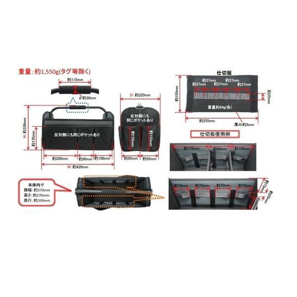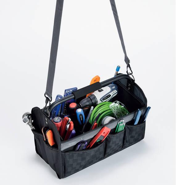 【商品説明】●特長●工具の収納・持ち運びに●出し入れしやすいフルオープンタイプ●折りたためて携帯・収納に便利●内側と外側に豊富な工具差し・収納ポケット付き●手が痛くなりにくいソフトグリップ●自由に動かせる仕切板2枚付き●持ち運びに便利ショルダーベルト付き●仕様、規格●サイズ 外寸:約幅420×高さ330×奥行き220(mm) 本体内寸:約幅370×高さ270×奥行き200(mm) 収納時外寸:約幅420×高さ330×奥行き90