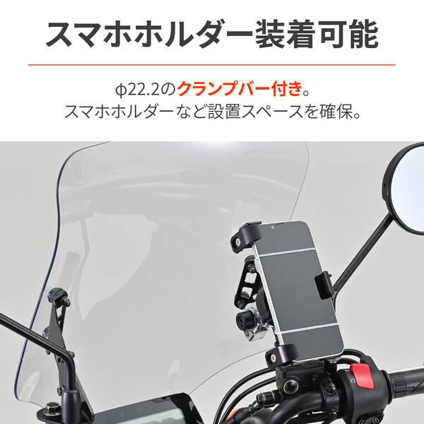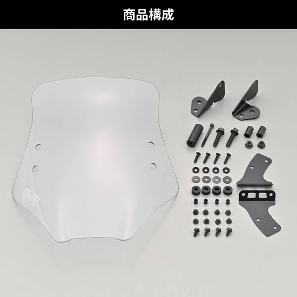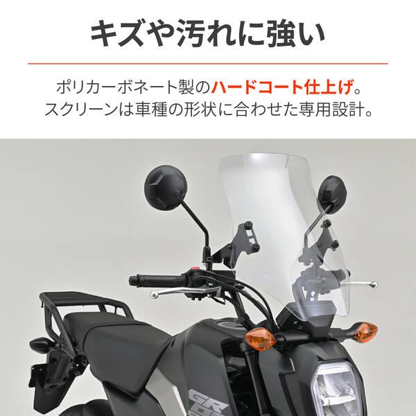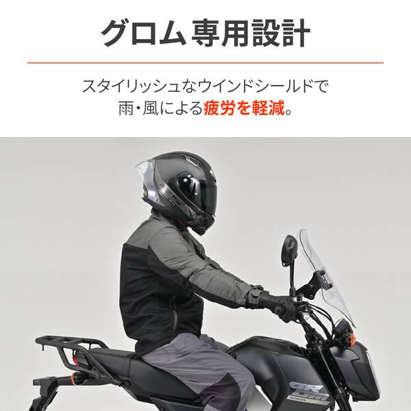 【商品説明】通勤快適コンセプト。スタイリッシュデザインのウインドシールドで雨・風での疲労を軽減。【スタイリッシュなエアロフォルム】三次元立体曲面成型により、スタイリッシュなエアロフォルムを演出するとともに、空気抵抗による疲労を軽減します。形状や特性に応じ、シールドはこだわりの車種専用設計。【ハードコーティング仕様】ウインドシールドは耐衝撃に強いポリカーボネートを採用。傷や汚れに強いハードコーティング仕様でクリアーな視界を長期にわたり確保。【角度調整可能】ウインドシールドの角度調整が可能な車体側取付ステーを採用。状況に合わせ約10度の範囲内でウインドシールドの角度調整が可能。【クランプバー付属】付属のクランプバーを装着すれば、市販のφ22.2パイプ用クランプが使用可能。スマホホルダーなどを装着可能です。●適合車種:グロム(21-24) [2BJ/8BJ-JC92]●雨や虫よけに効果があり、空気抵抗による疲労を軽減●三次元立体成型シールドで、特性に応じた車種専用設計 / 約10度の角度調整可能●φ22.2mmのクランプバーでスマホホルダーなど装着可能●耐衝撃に強いポリカーボネート製シールド。ハードコーティングで傷や汚れにも強いGROM(21-24) [2BJ/8BJ-JC92]※ ウインドシールドは太陽光を直接当てると、小さな領域に集光する光学的特性上、車体の他の部分に損傷を与える場合があります。直射日光が当たったままの状態で駐車しないでください。※ ガソリン・シンナー等有機溶剤・コンパウンド入りのクリーナー等は使用しないでください。